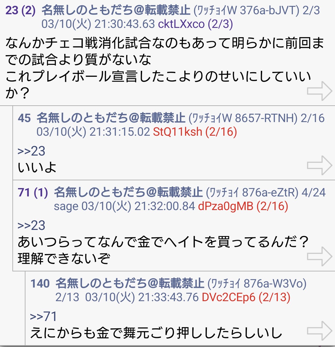 | … | 74無題Name名無し 26/03/07(土)23:07:07No.1955648そうだねx4うちのライバーと比較する形で他の配信者に攻撃するのをやめてくださいって言われたからって他の配信者同士を比較する形なら攻撃していいってもんじゃないからな |