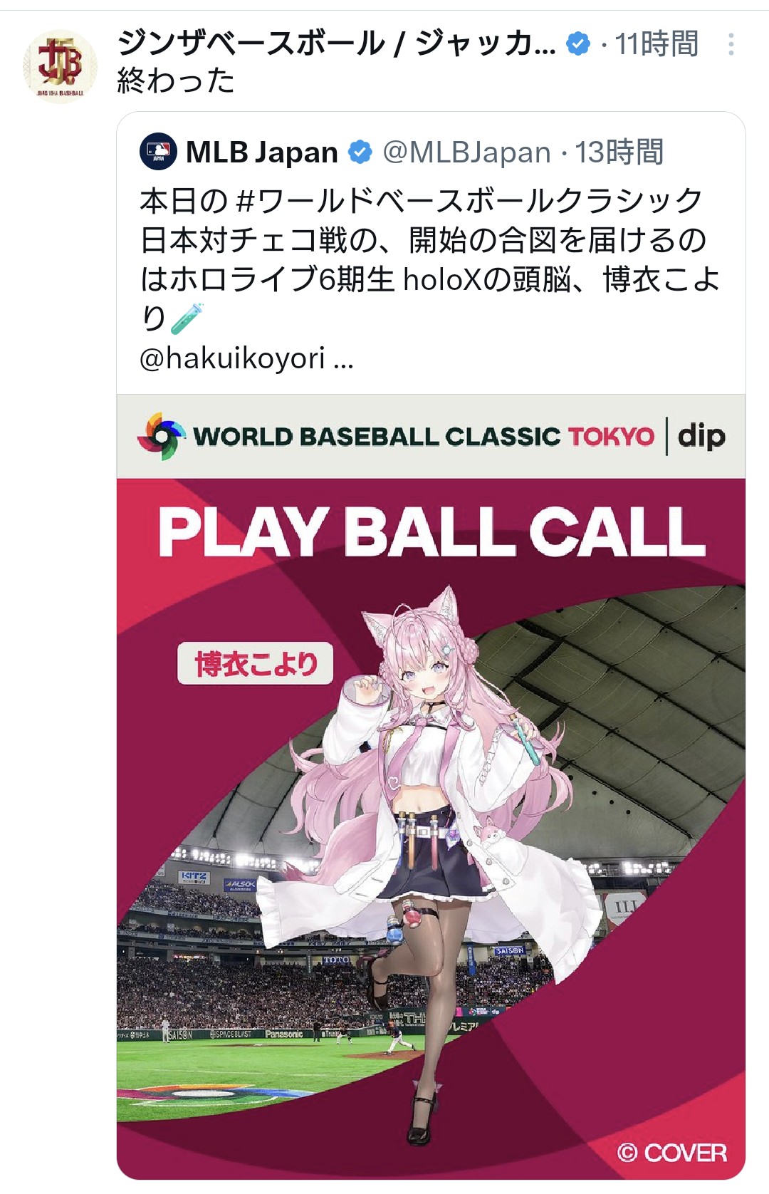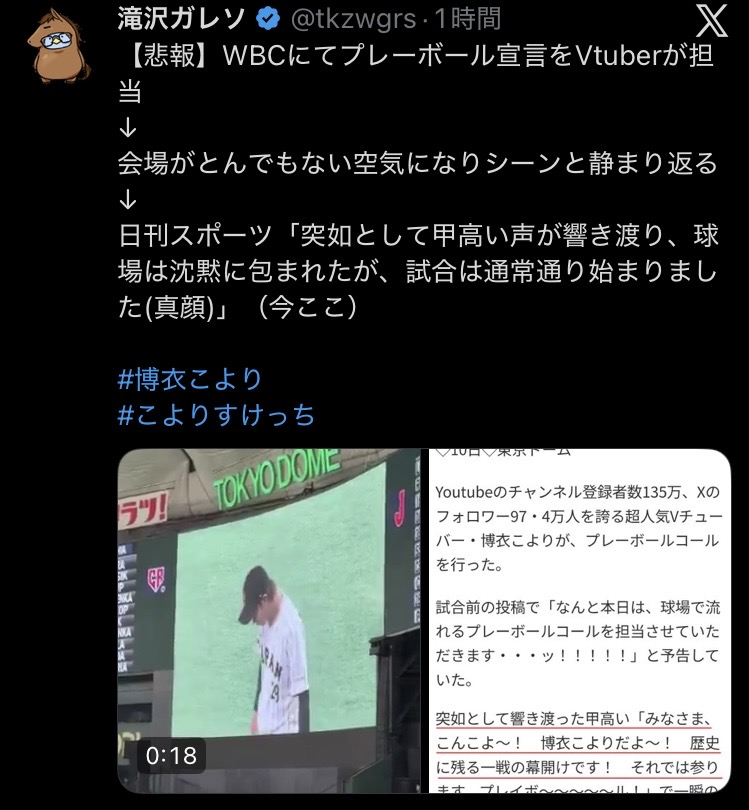 | … | 1992無題Name名無し 26/03/17(火)00:00:13No.1958218そうだねx25ちなみにベネズエラ戦のプレイボールコールはVTuberではなく格闘家なんだけどね |