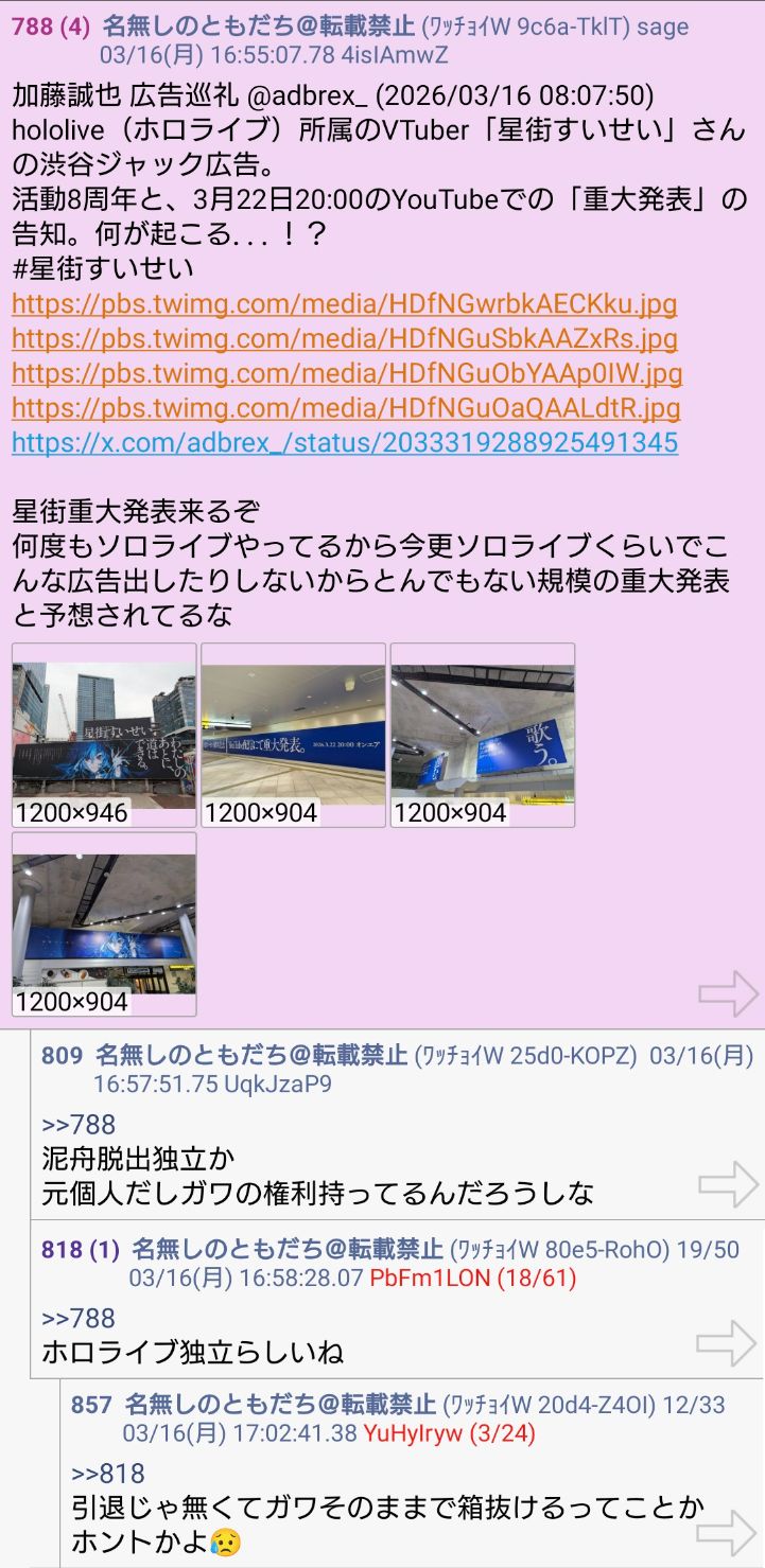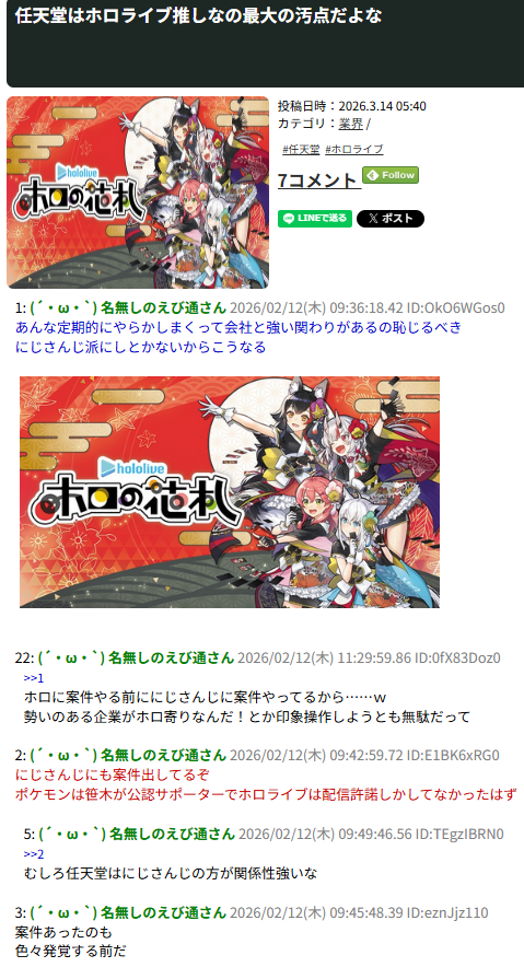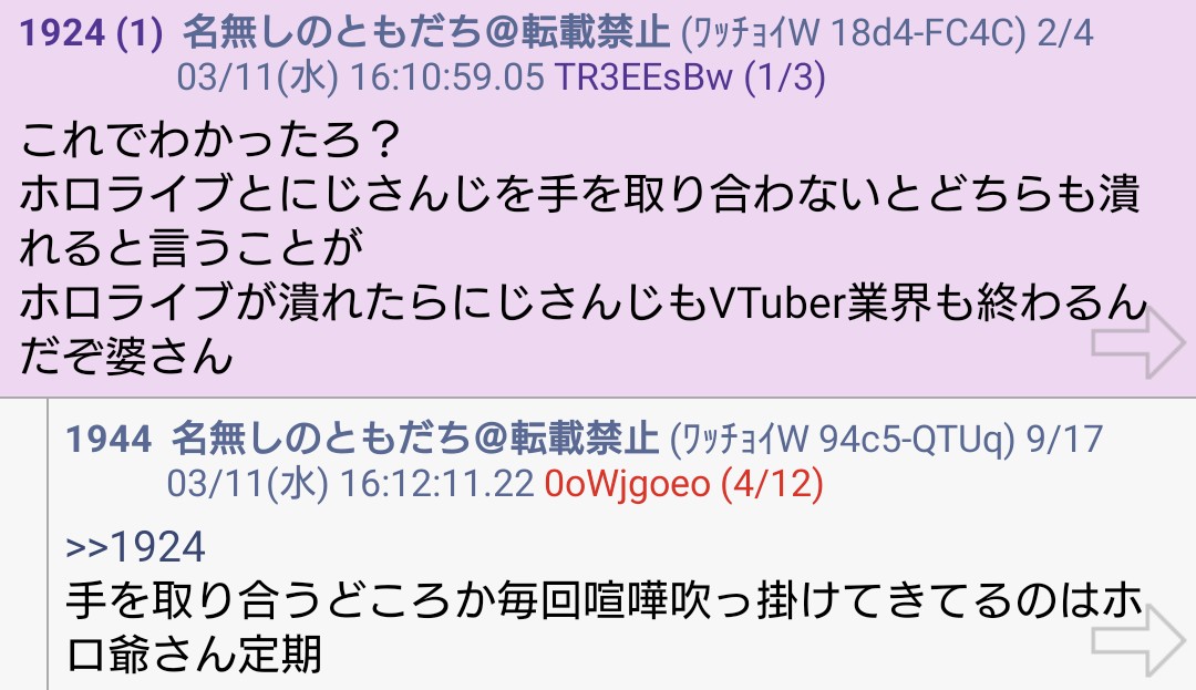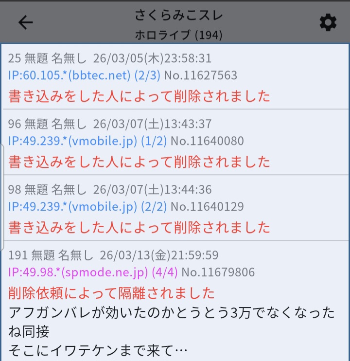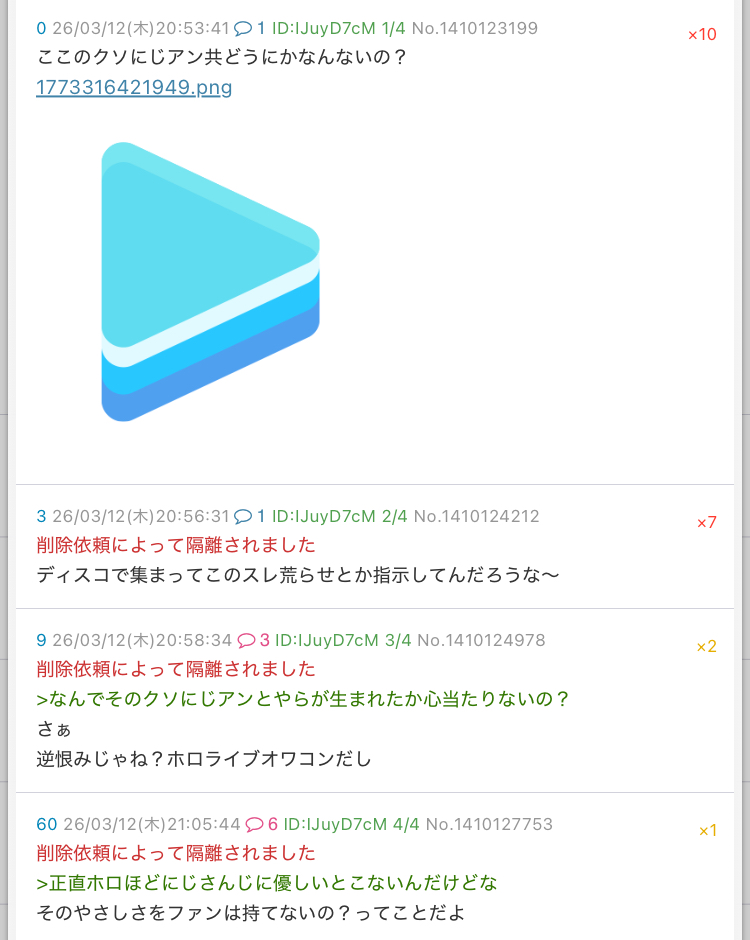 | … | 88無題Name名無し 26/03/07(土)23:21:07No.1955663そうだねx14>「ホロライブが出してるのは残飯か豚の餌」(葛葉、フレン、にじさんじ、奈羅花、くろのわ、ろふまお、石神、不破リスナー)※過去に湊あくあが卒業ライブで歌った乃木坂の曲のMV、でびでびでびるの炎上に際して、それぞれ非Vファンのような口ぶりで粘着していた点に留意 |