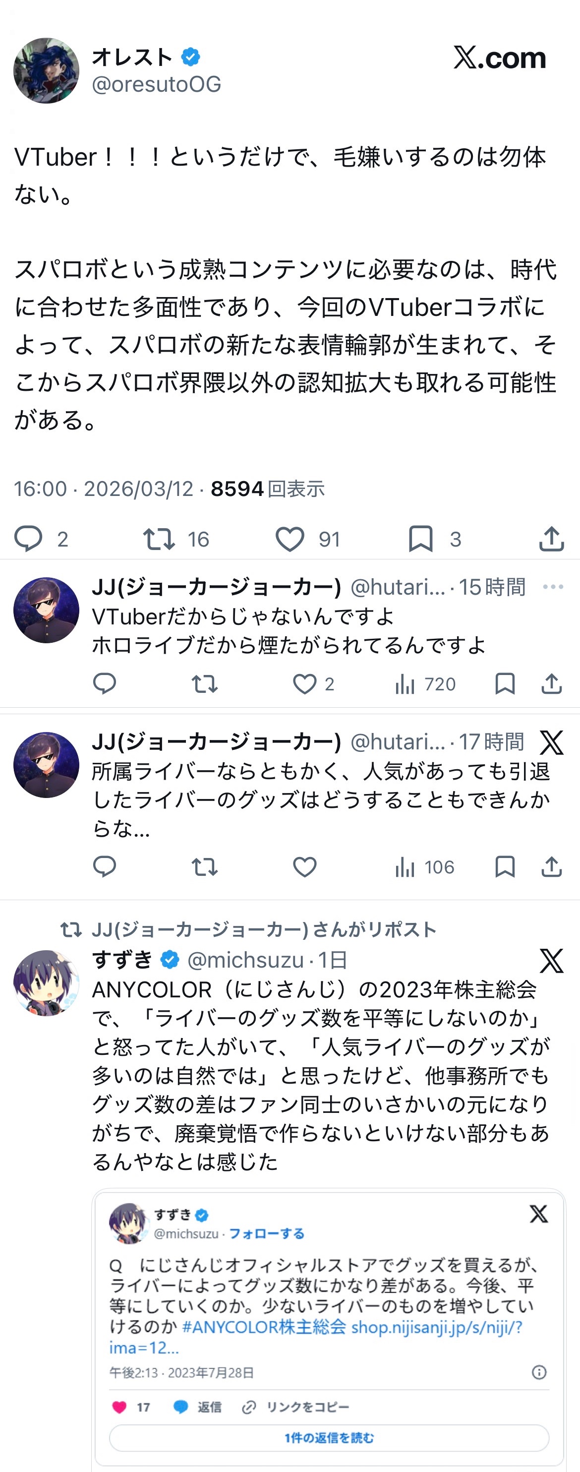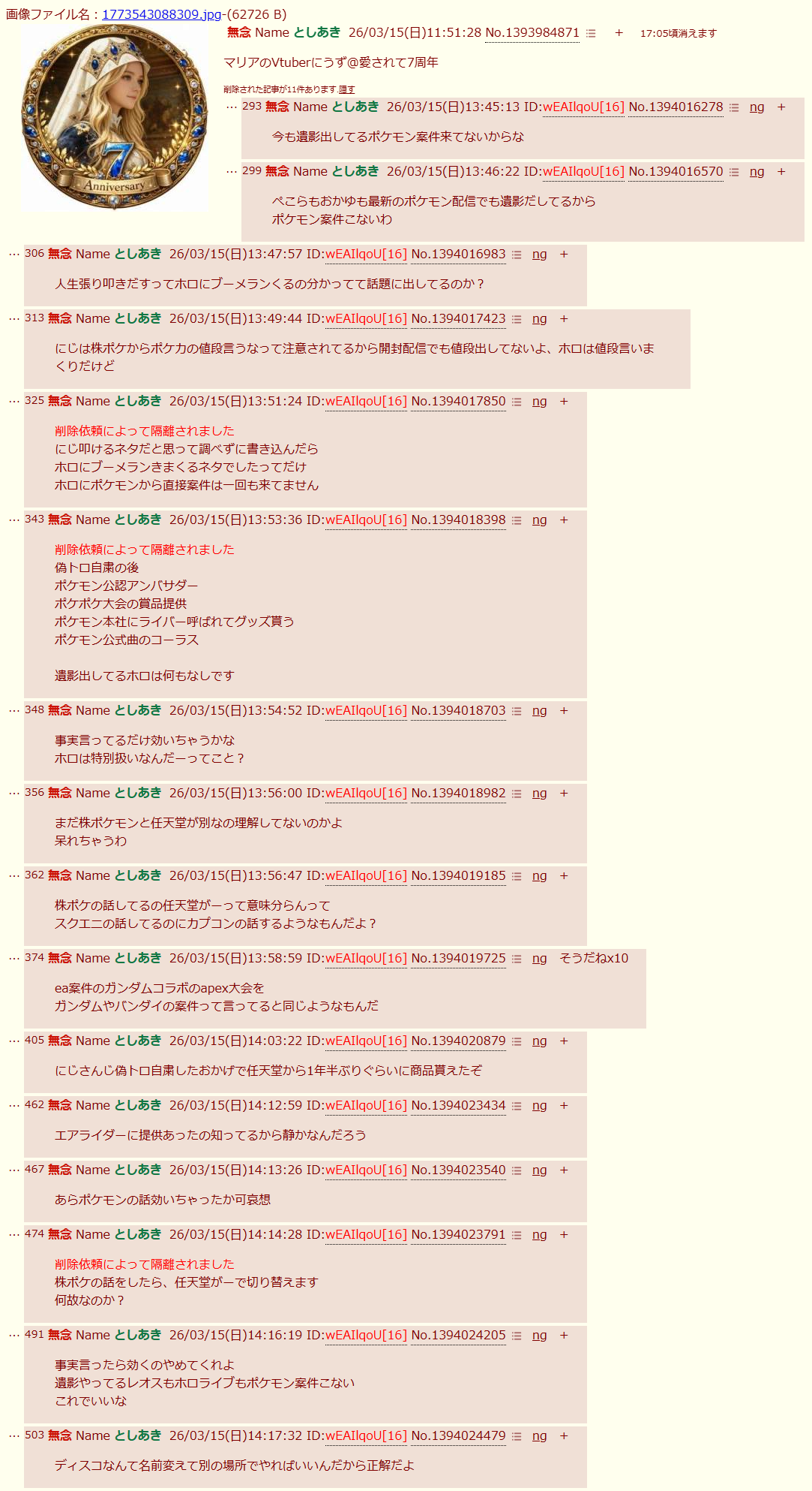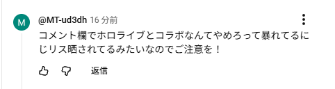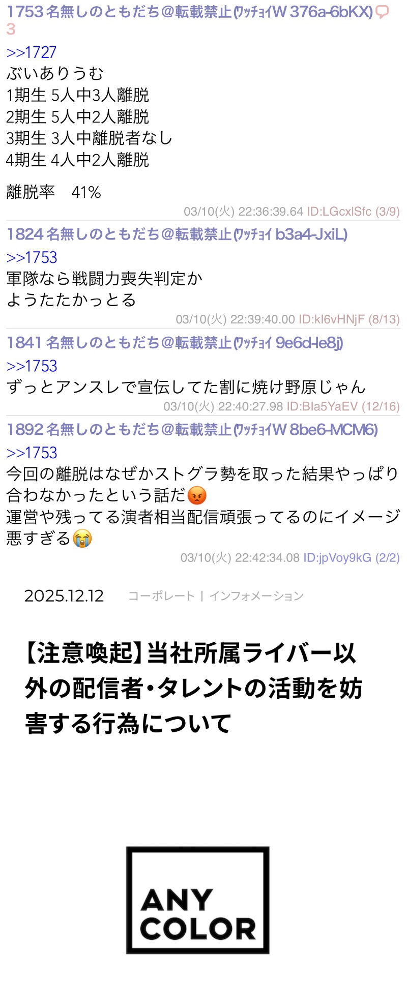 | … | 88無題Name名無し 26/03/07(土)23:21:07No.1955663そうだねx14>「ホロライブが出してるのは残飯か豚の餌」(葛葉、フレン、にじさんじ、奈羅花、くろのわ、ろふまお、石神、不破リスナー)※過去に湊あくあが卒業ライブで歌った乃木坂の曲のMV、でびでびでびるの炎上に際して、それぞれ非Vファンのような口ぶりで粘着していた点に留意 |