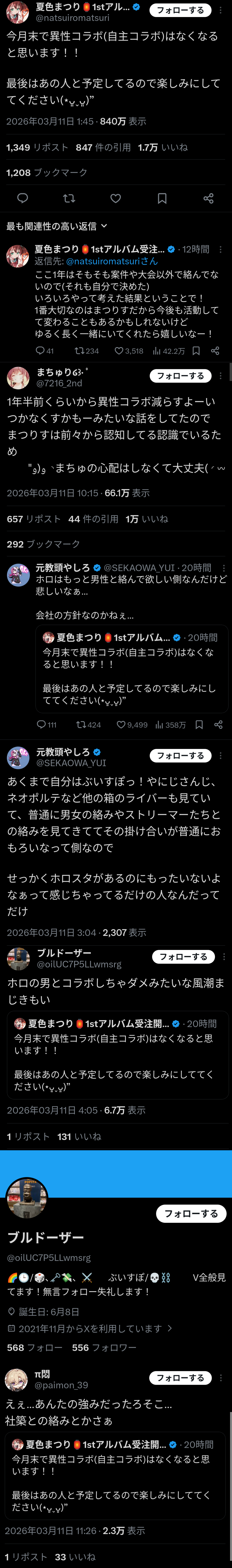 | … | 61無題Name名無し 26/03/07(土)23:04:04No.1955635そうだねx15「ホロは残飯みたいなの喜んでうまそーとか言っちゃうのが良くないとこだよな 男と絡んだだけで炎上させるんじゃなくてもっと別があるだろうにw」(葛葉、にじさんじ、ニュイ、緑、天宮、グウェル、叶、樋口、月ノリスナー) |