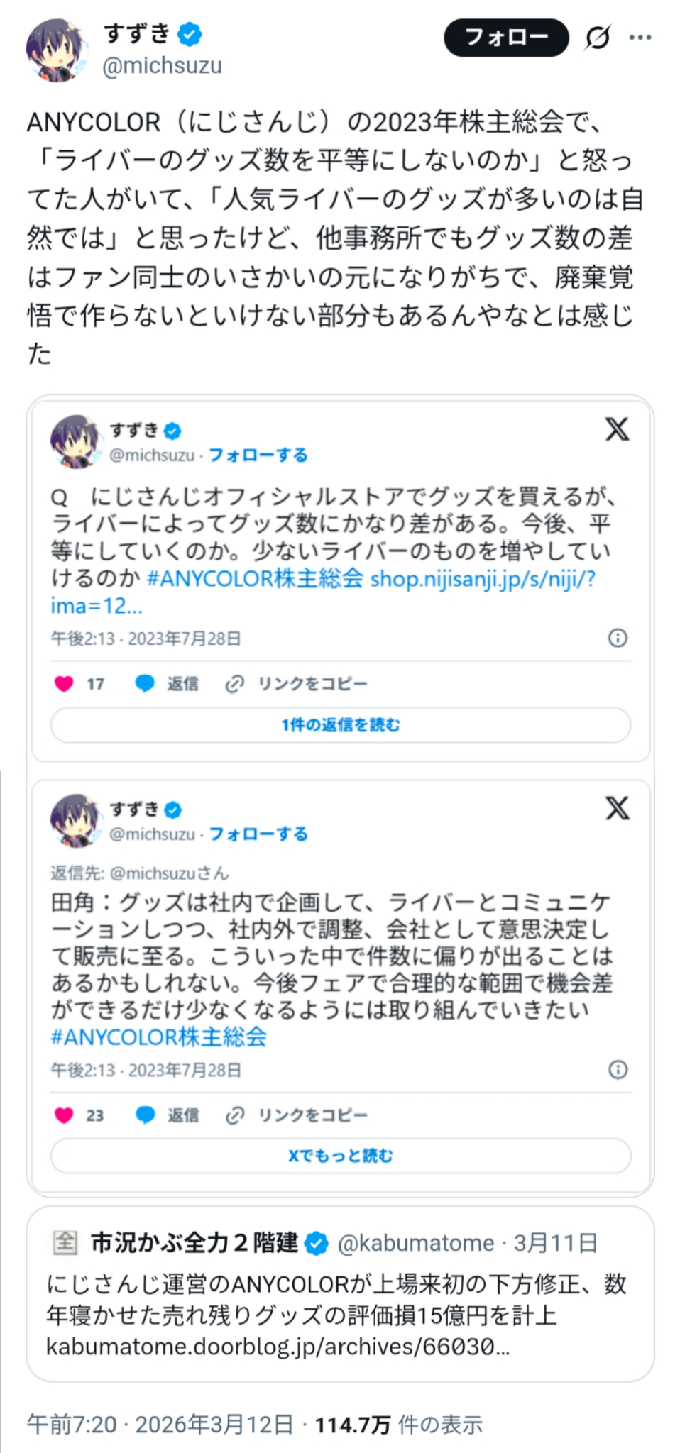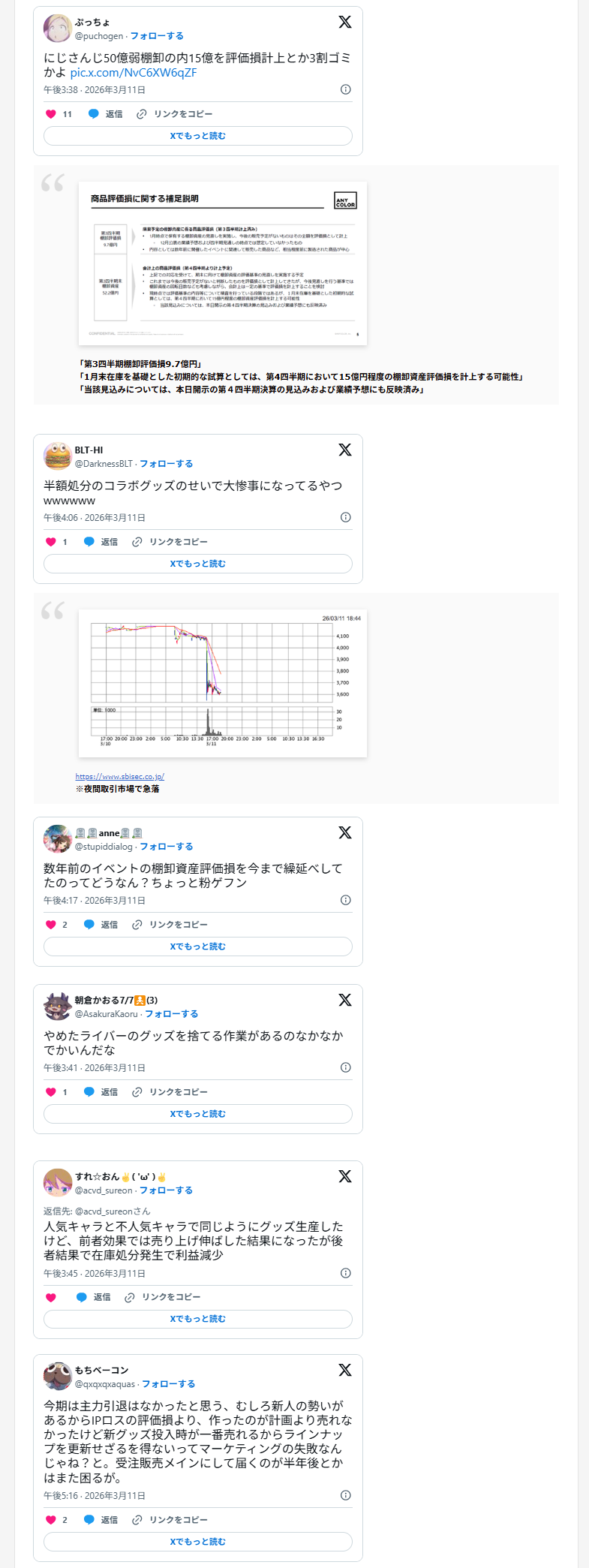| … | 1969無題Name名無し 26/03/16(月)22:54:53No.1958194そうだねx3決算説明会の質疑が15問でうち6問が商品在庫の取り扱いや評価損計上の件 |
