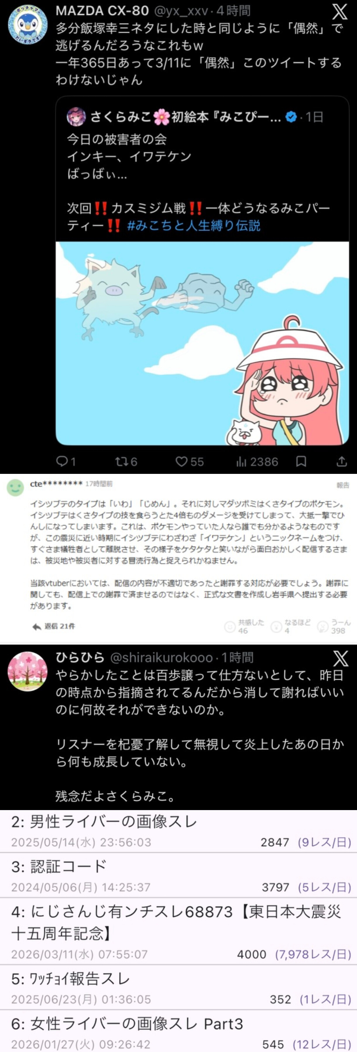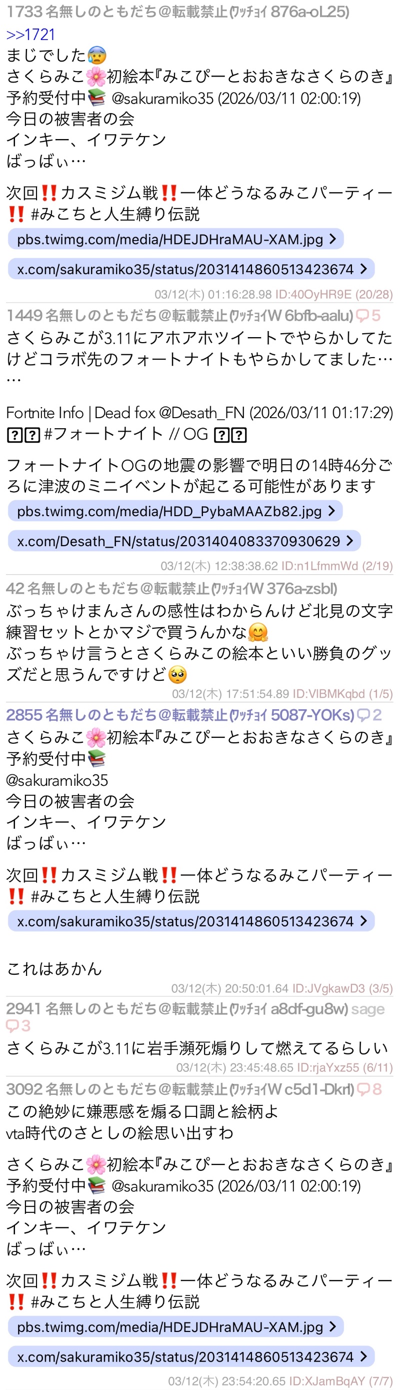 | … | 89無題Name名無し 26/03/07(土)23:22:20No.1955664そうだねx10またコレコレがKickって配信サイトでさくらみこデブって中傷してたわ |