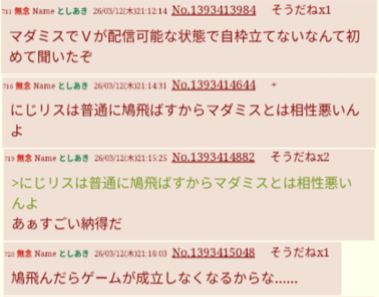 | … | 92無題Name名無し 26/03/07(土)23:22:48No.1955667そうだねx21>「ホロリスだけどあれは擁護できん 今年はなんかマシそうだったけど」(月ノ、加賀美、樋口、早乙女、社、フレン、夜見リスナー) |