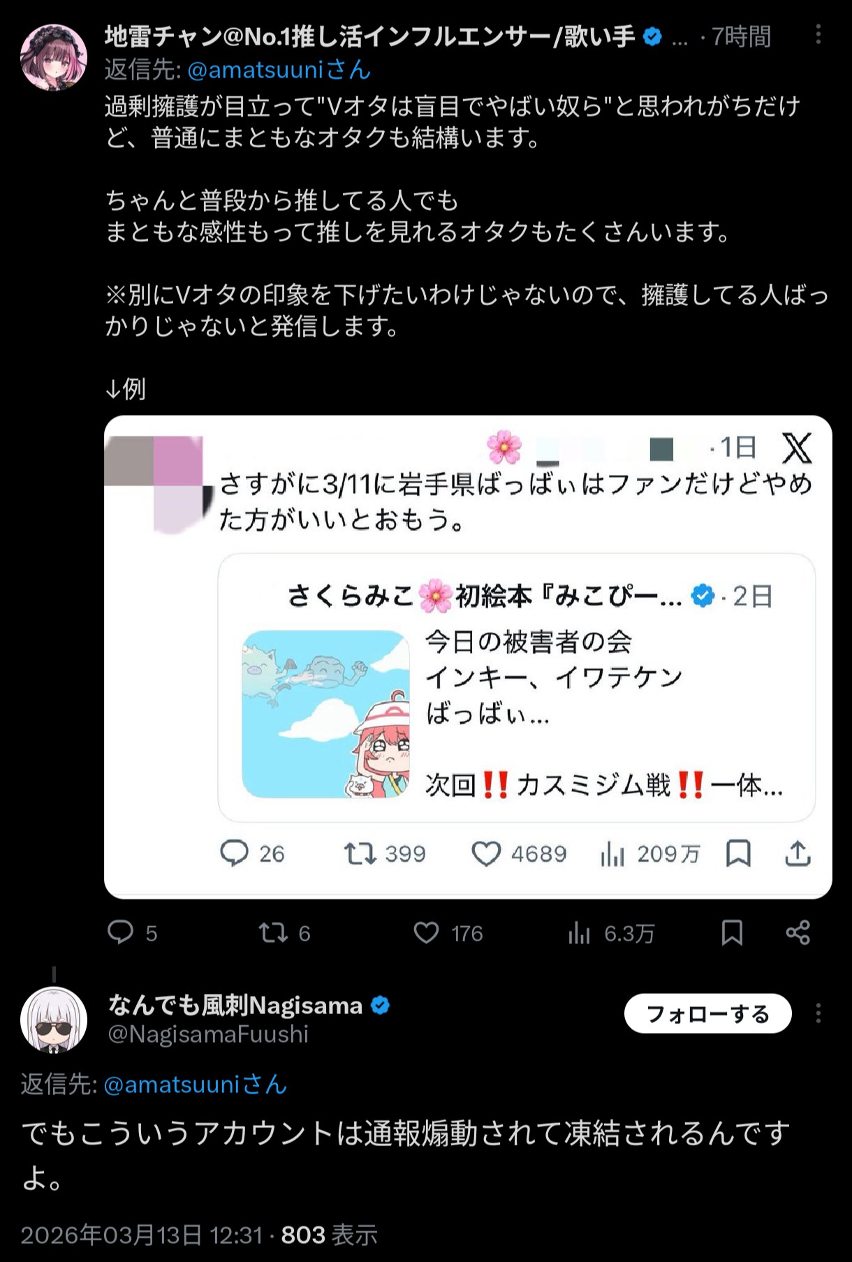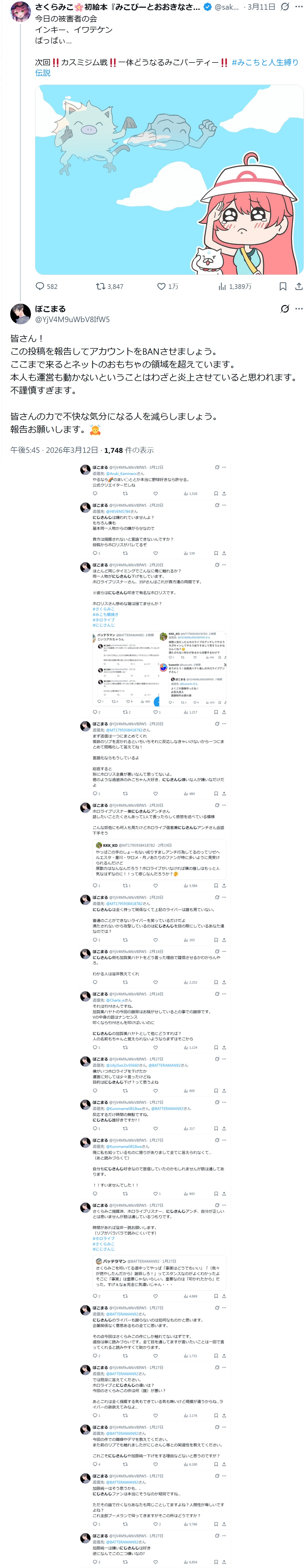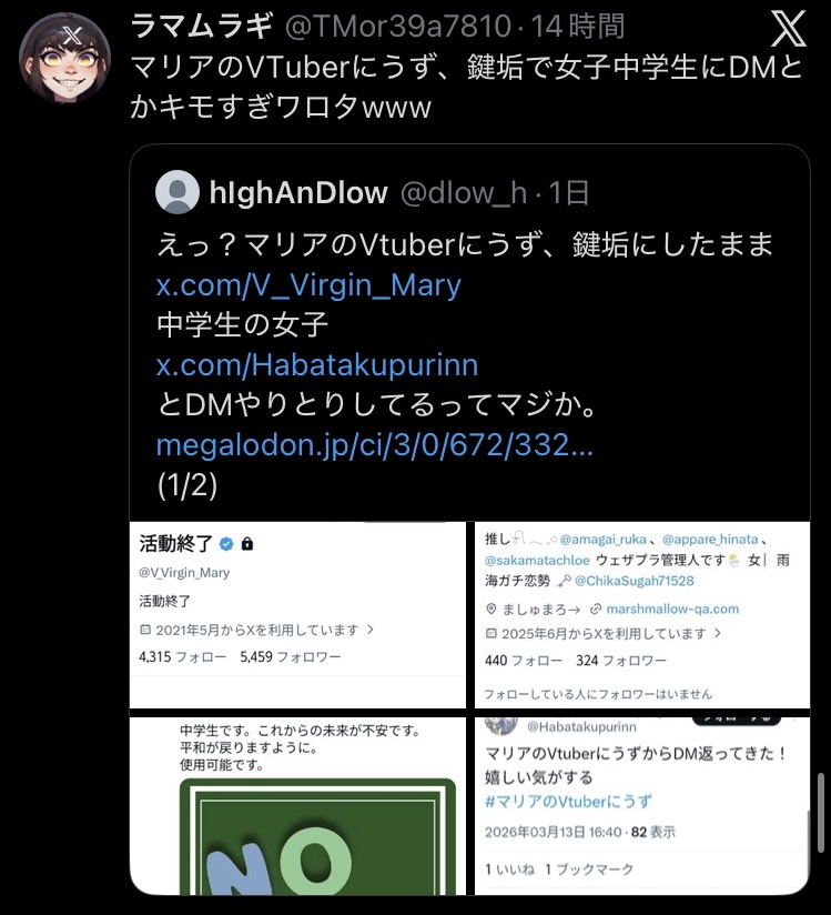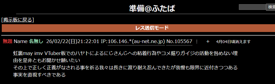 | … | 8無題Name名無し 26/03/07(土)22:01:37No.1955576そうだねx2※このスレはにじさんじの運営、ライバー、リスナーの迷惑行為や道徳に反する行動を収集するスレです |
