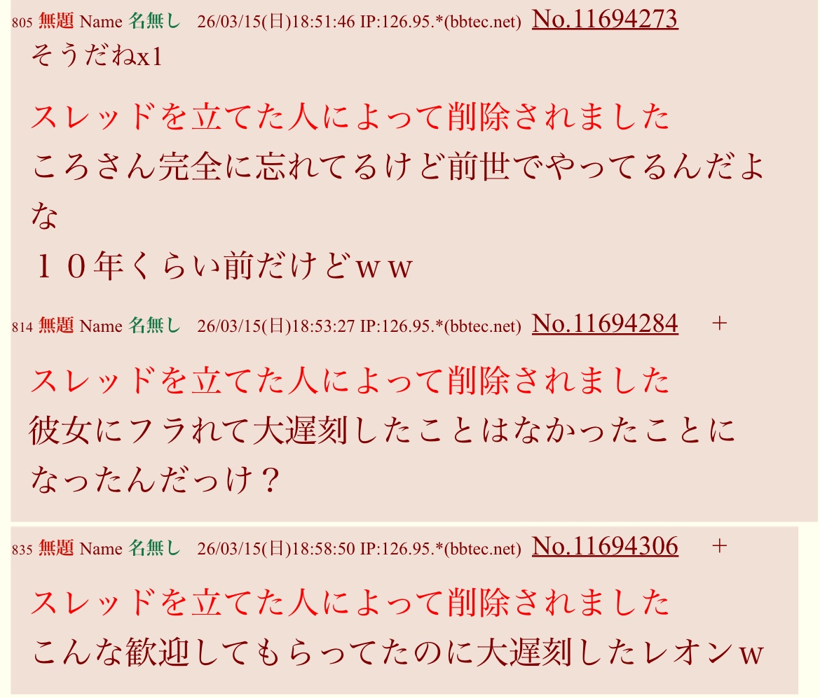 | … | 1993無題Name名無し 26/03/17(火)00:01:21No.1958219+書き込みをした人によって削除されました |