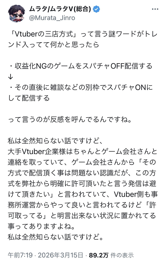 | … | 1924無題Name名無し 26/03/16(月)19:14:27No.1958136そうだねx1最低でもそういう規則があるって発言がライバーから出ない限りはここでは何とも言えないでしょ |