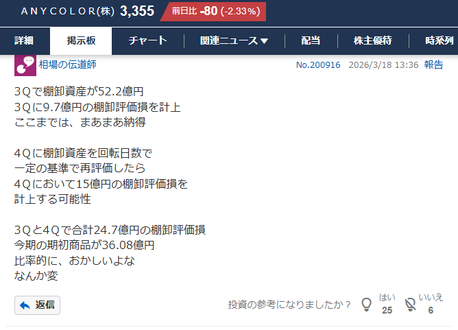 | … | 33無題Name名無し 26/03/18(水)22:09:14No.1958611そうだねx625億の評価損は前向きに捉えるなら今期の業績を踏まえてこのタイミングに膿を出しきろうという考えも持てる |