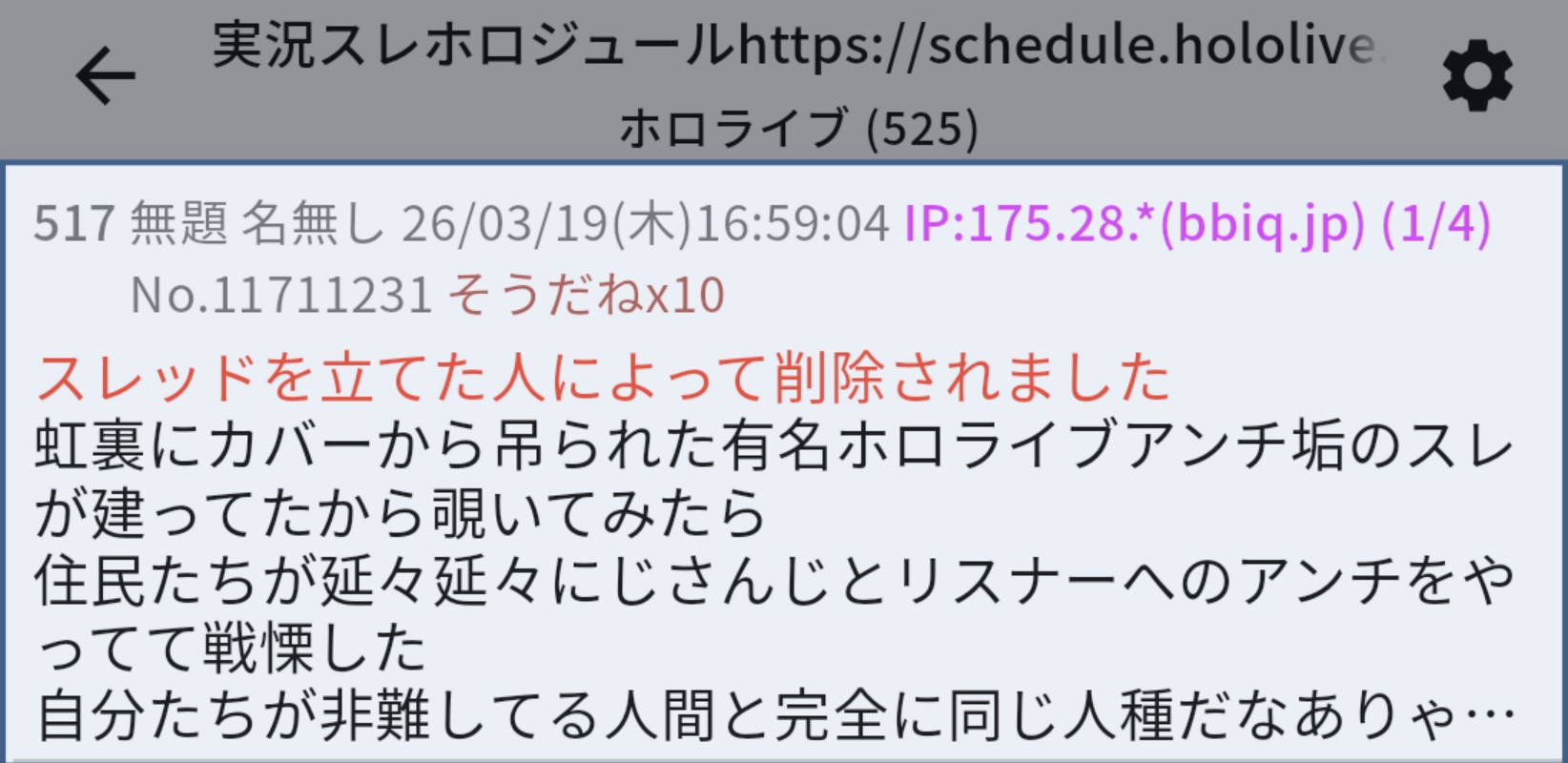 | … | 295無題Name名無し 26/03/20(金)11:53:32No.1959014そうだねx2>ホロスレじゃないから話題の取り扱い方間違えるなはそうだけどにじスレ貼ったらホロスレ扱いにしようとしてるはよく分からん |