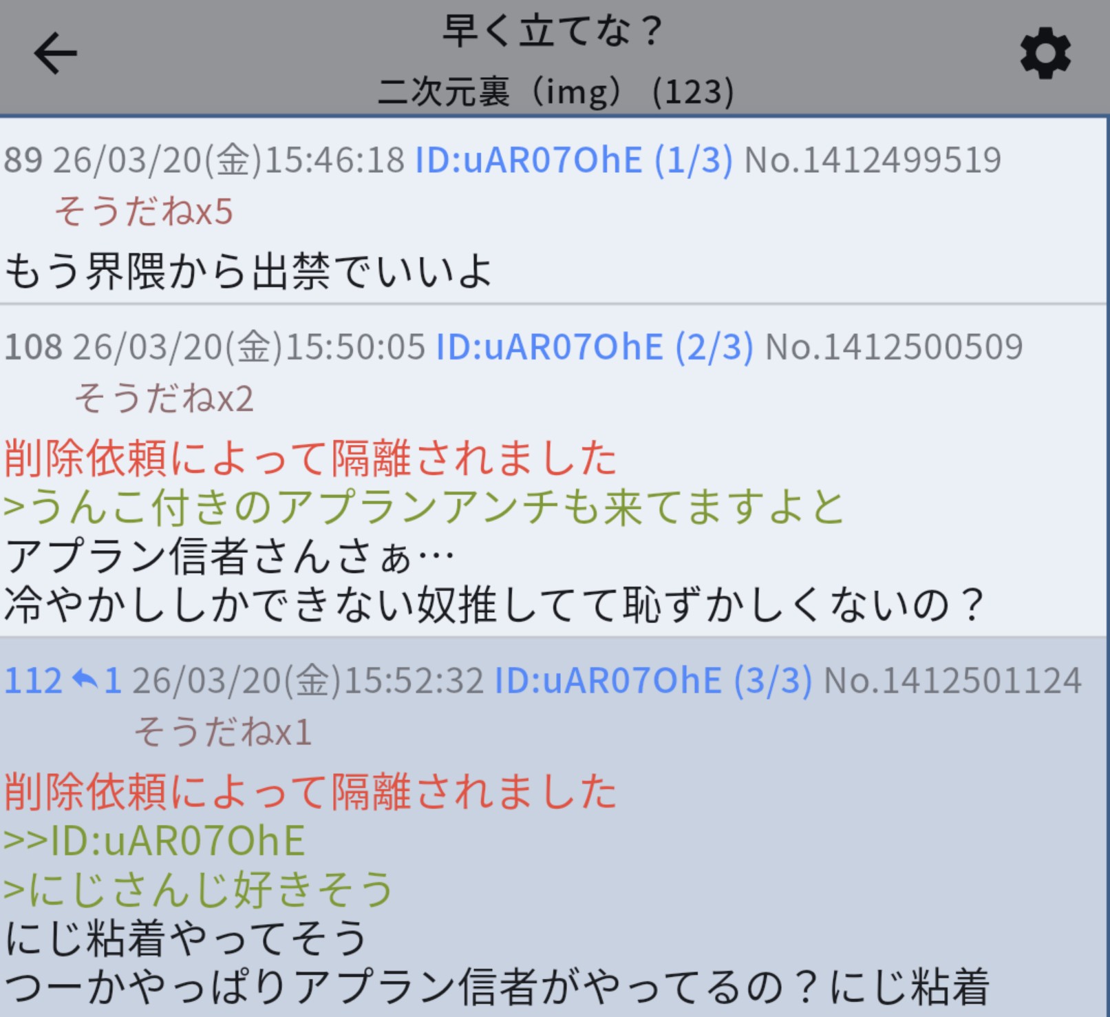 | … | 22無題Name名無し 26/03/18(水)21:06:10No.1958592そうだねx4前も今回みたいに荒らし目的でスレ立てて荒らして回線焼いてってスレあったけど隔離された後放棄して新しくスレ立ててたから別にあっちを律儀に使う必要はないとは思うが |