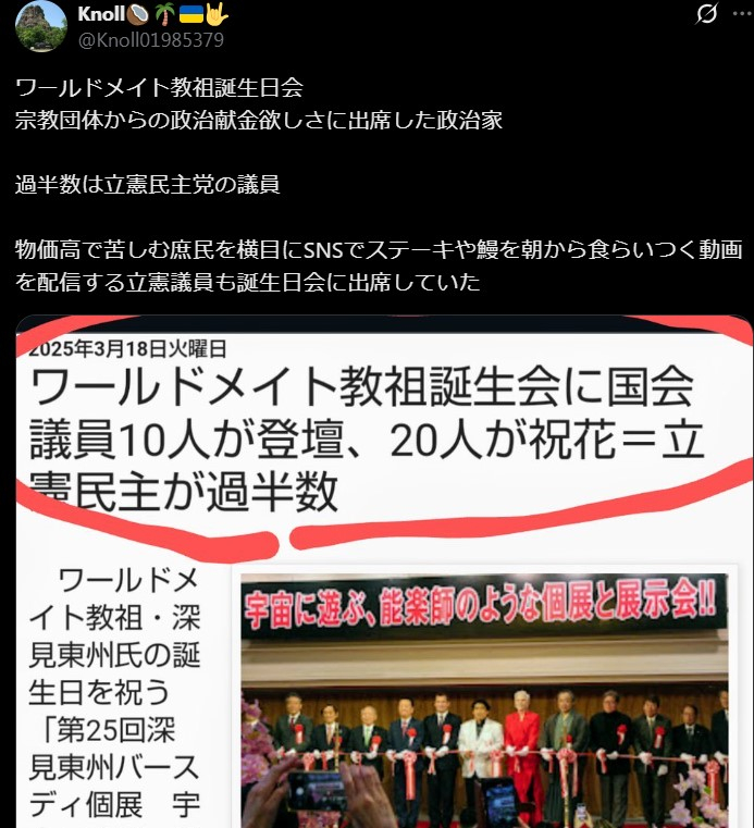 | … | 41無題Name名無し 26/02/16(月)03:31:21No.10957+ 1771180281207.jpg-(295408 B) 【Xで話題】霊感商法大手ワールドメイト、立憲民主党に1億960万円の献金 |