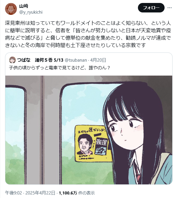 | … | 87無題Name名無し 22/07/22(金)18:31:25No.5423+【これが宗教に魂を売った物の姿だ】山上徹也の母、暗殺事件の発端になった『統一教会』に謝罪★2 [Stargazer★] |