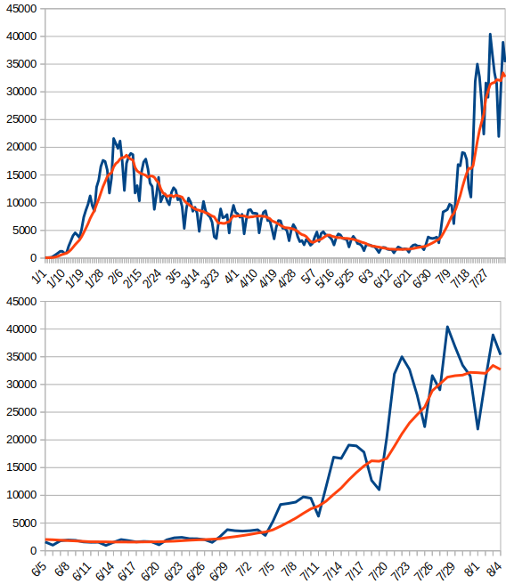 | … | 1無題Name名無し 22/08/04(木)16:53:54No.188935+ 1659599634517.png-(69937 B) 青は東京の新規感染者数、赤は東京の新規感染者数7日移動平均です |