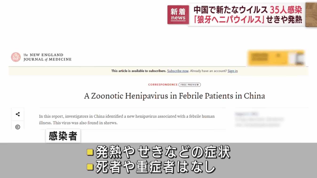 「狼牙ヘニパウイルス(LayV)」と名付けられた同ウイルスは、中国東部で動物に最近接触したことがある発熱者の早期検知システムによって見つかった。患者は主に農業従事者で、倦怠(けんたい)感や咳、食欲不振、痛みなどの症状が報告された。何人かに血球の異常や肝臓・腎臓損傷が見られたが、死者はいない。