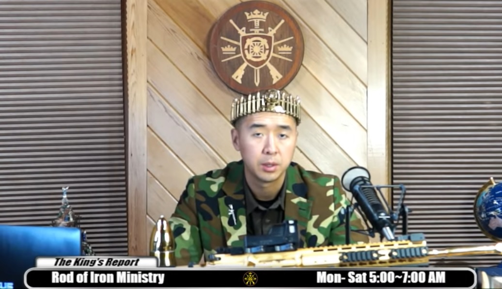 講演を行った亨進氏も頭に銃弾の王冠を載せた姿で新型コロナワクチンを批判し、ワクチン普及を共産主義者の陰謀だと語った。