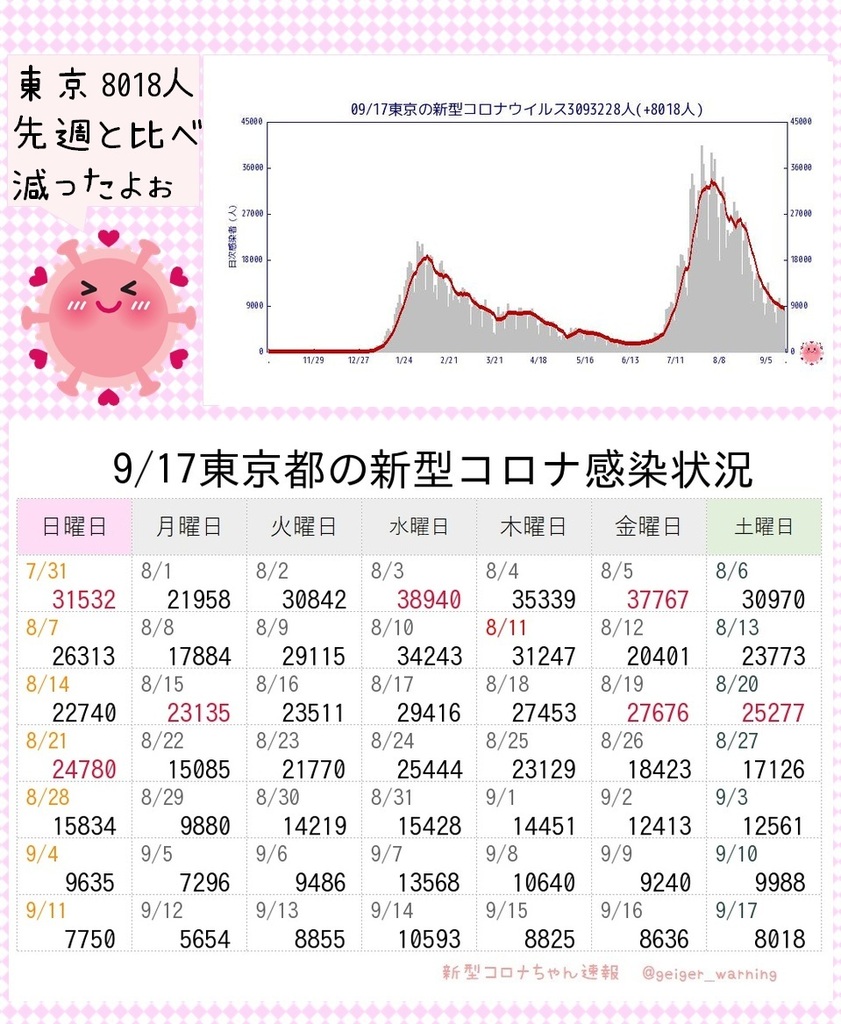 | … | 2無題Name名無し 22/09/17(土)17:31:58No.191137+ 1663403518373.png-(23591 B) 一週間の東京の新規感染者数累計でみると、先週は69,853人、今週は58,331人でした |