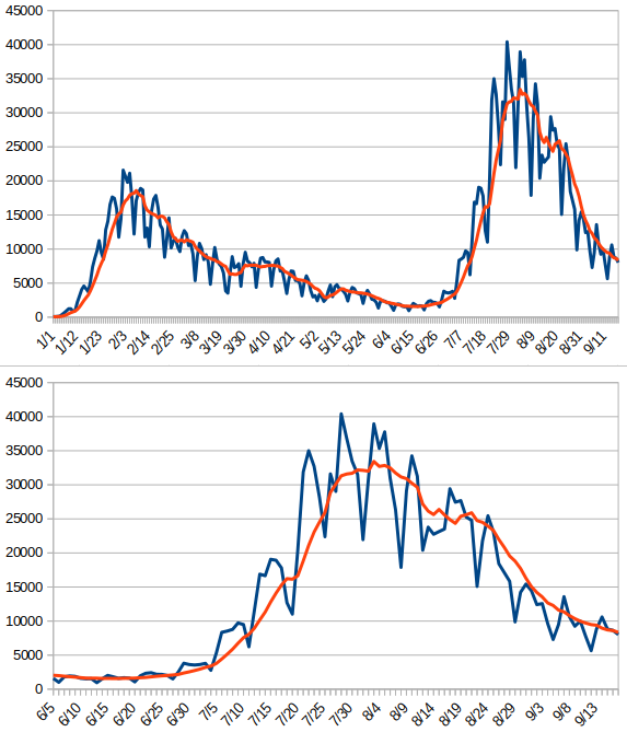 | … | 1無題Name名無し 22/09/17(土)16:58:09No.191136そうだねx1 1663401489594.png-(83283 B) 青は東京の新規感染者数、赤は東京の新規感染者数7日移動平均です |