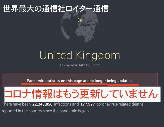 | … | 7無題Name名無し 22/09/18(日)10:40:05No.191155+ 1663465205086.jpg-(50030 B) ロイター、コロナサイトの更新やめたってよ。 |