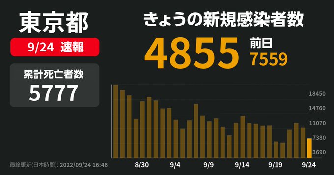 | … | 4無題Name名無し 22/09/24(土)16:58:32No.191383+ 1664006312624.png-(23941 B) 東京の一週間の累計新規感染者数は先週58,331人、今週は44,263人です |