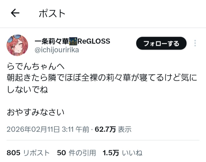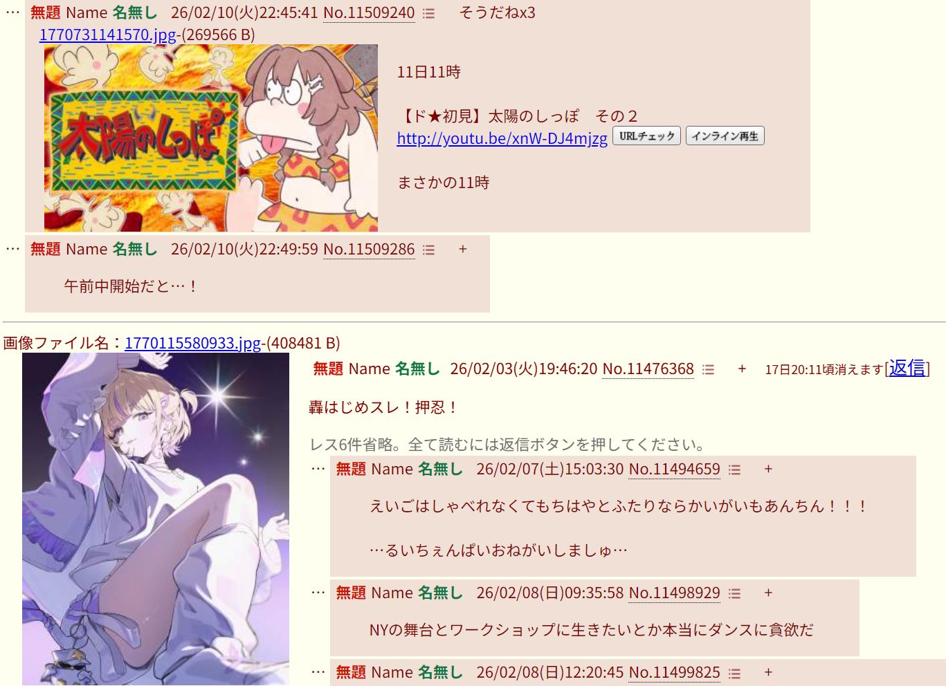 | … | 48無題Name名無し 26/02/11(水)00:37:37No.11509706そうだねx3>平日昼からとは厳しいな… |
