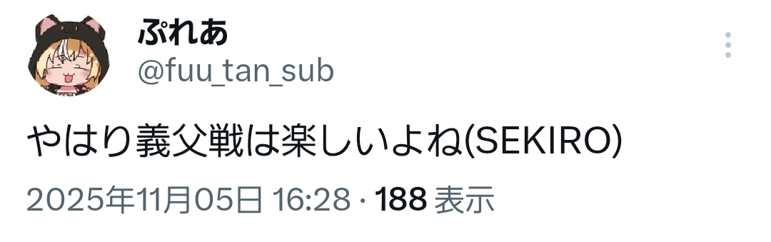 | … | 913無題Name名無し 25/11/05(水)19:34:22No.10829220+ぺこちゃんSEKIROクリア耐久とか言ってるな |