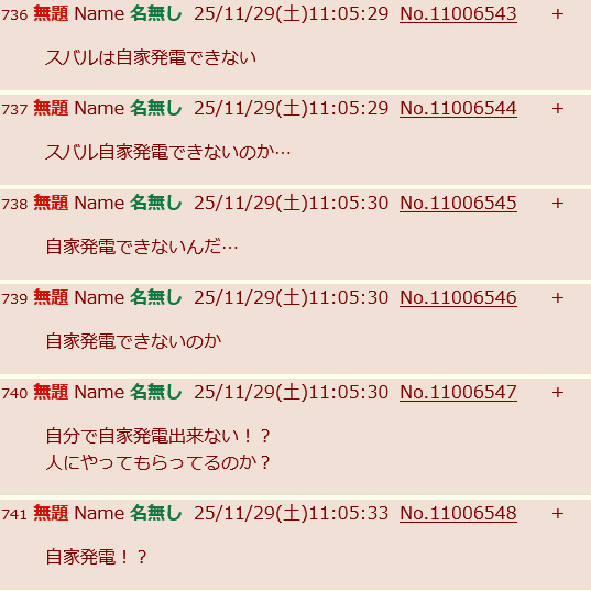 | … | 29無題Name名無し 25/11/29(土)10:17:37No.11005824+スバルのアナルが破壊された?! |