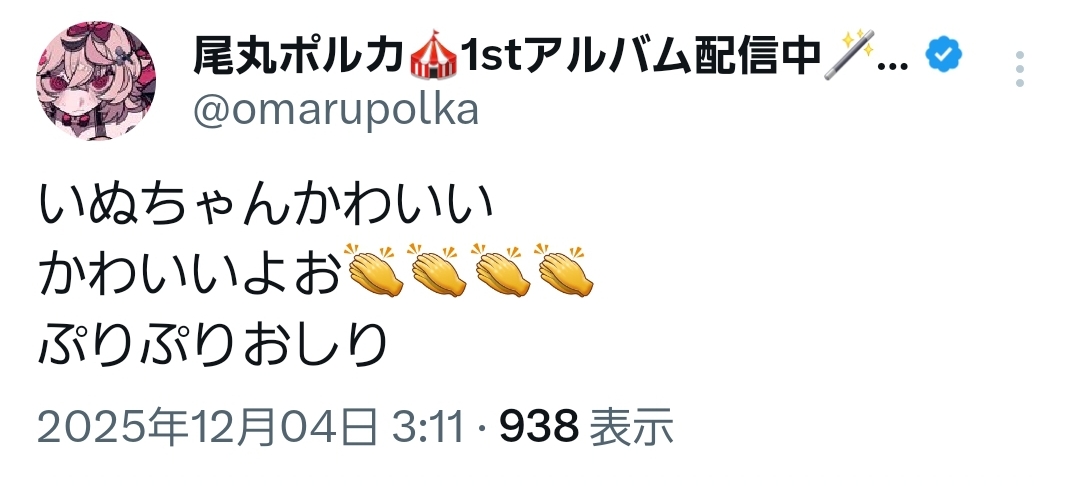 | … | 933無題Name名無し 25/12/04(木)19:36:01 IP:1.73.*(spmode.ne.jp)No.11050283+ファンからのプレゼントが尻の穴に張り付いたマリン |