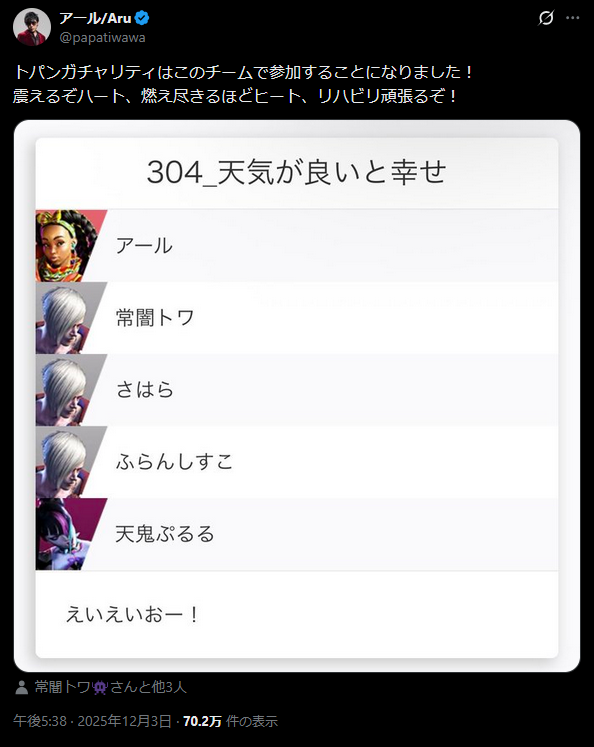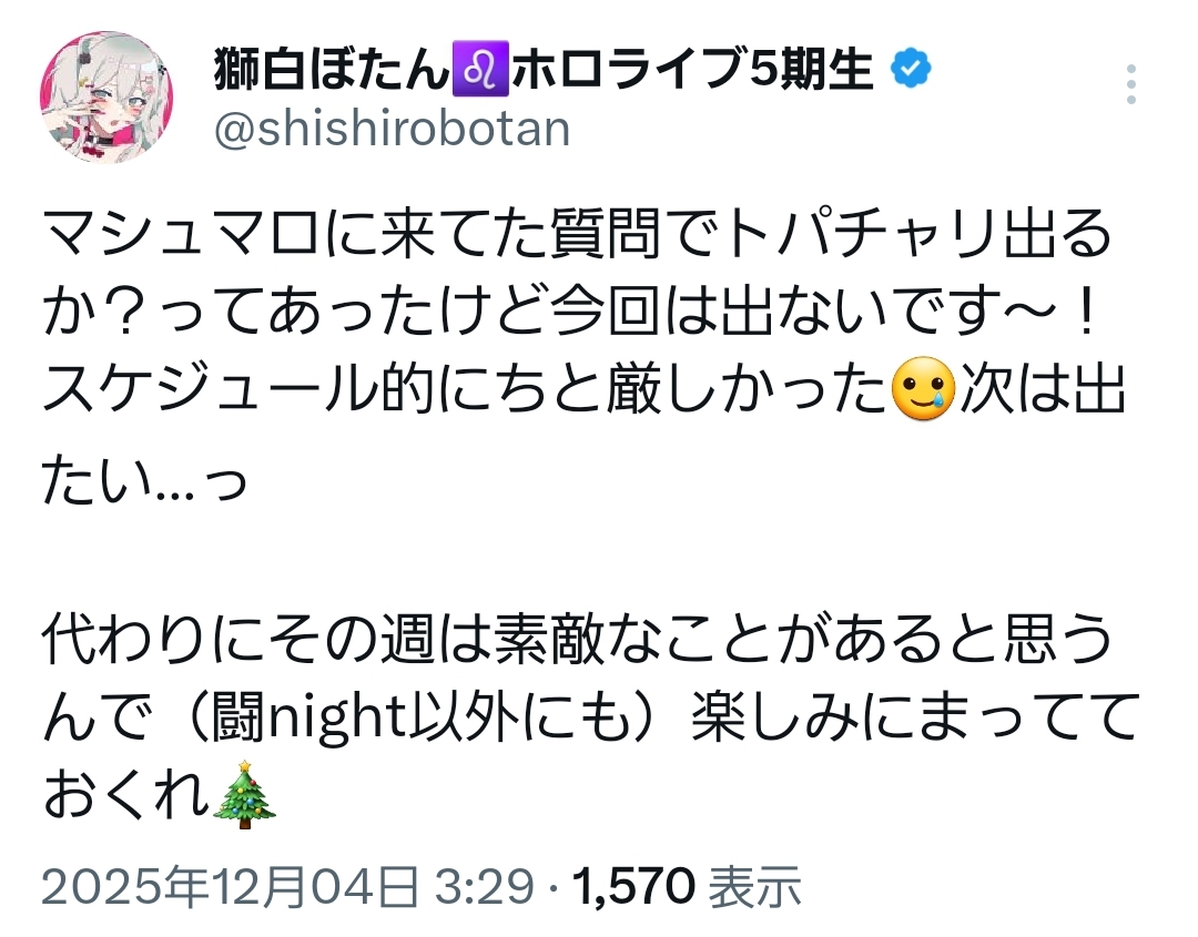 | … | 27無題Name名無し 25/12/04(木)03:02:19 IP:60.98.*(bbtec.net)No.11048942+団長ふーたんって来たらあと船長とぺこちゃんか… |
