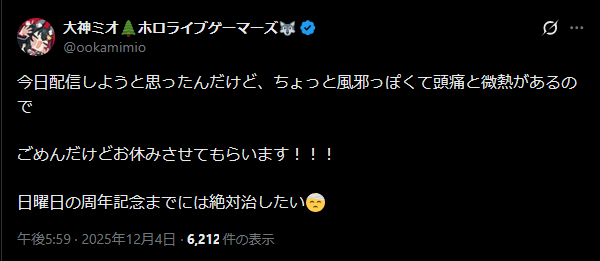 | … | 907無題Name名無し 25/12/04(木)19:34:07 IP:217.178.*(transix.jp)No.11050255+とりあえずこよりの安否確認 |