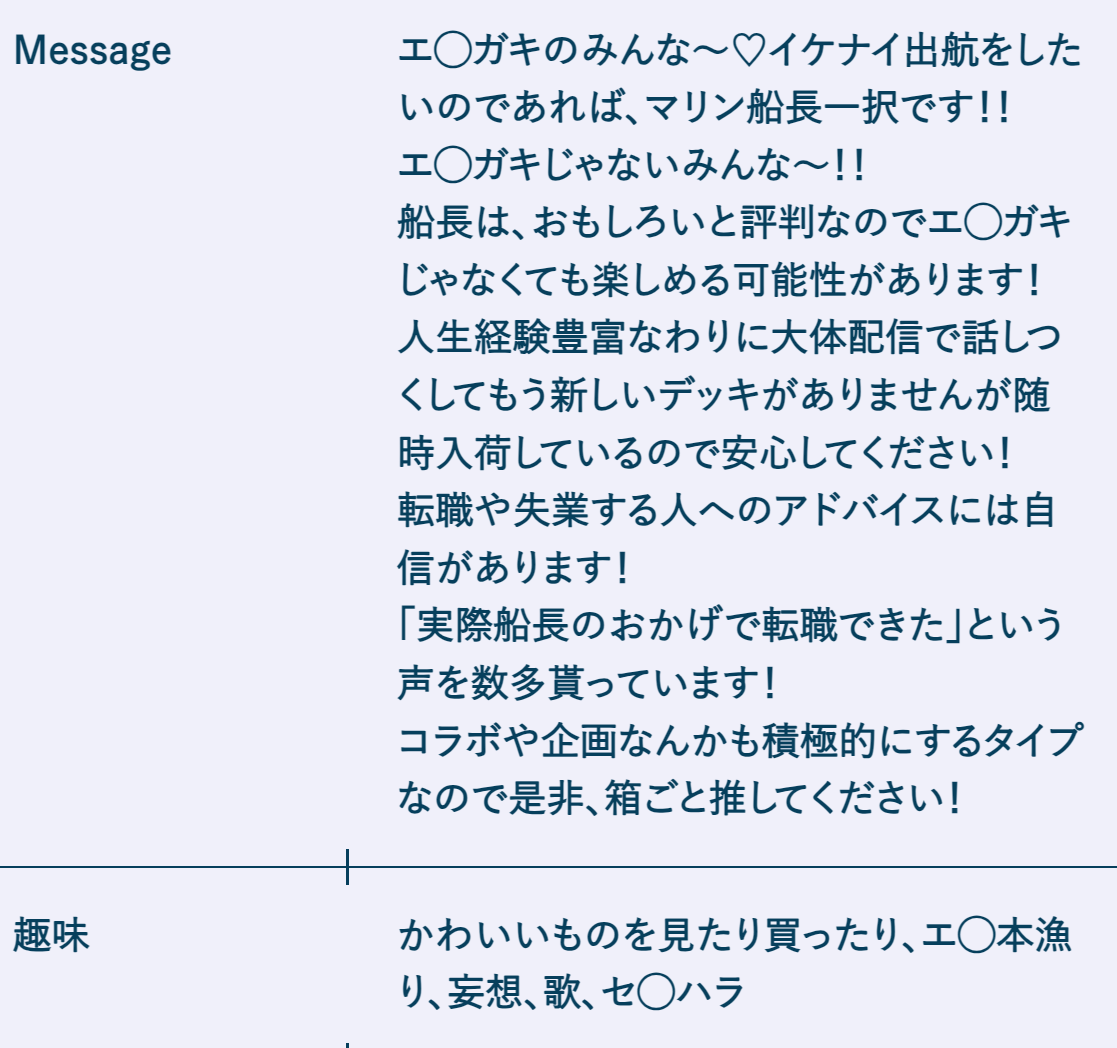 | … | 85無題Name名無し 25/12/05(金)19:23:27 IP:60.152.*(bbtec.net)No.11055046そうだねx1みこち前に船長とおかゆにいじられて以降更新したんかな? |