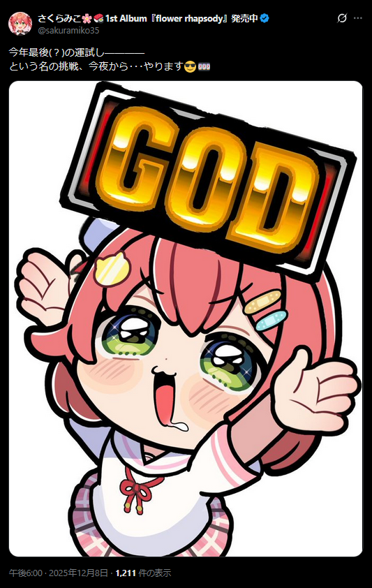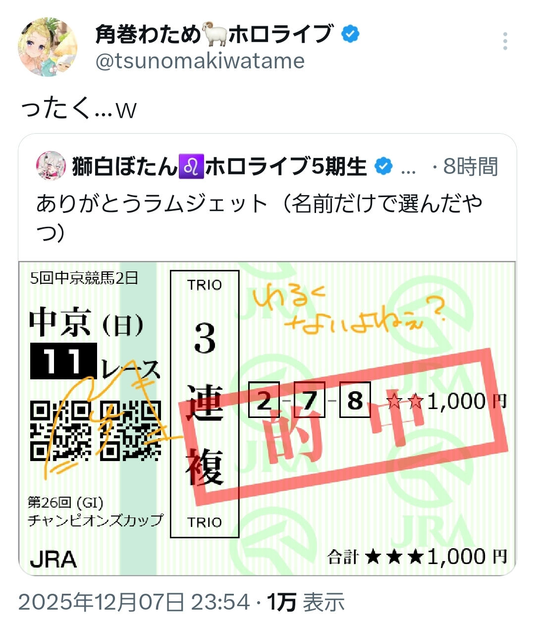 | … | 54無題Name名無し 25/12/08(月)00:18:18 IP:217.178.*(transix.jp)No.11076109そうだねx7 1765120698148.png-(1450812 B) わためぇ3000本です |