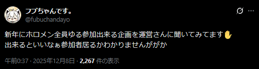 | … | 91無題Name名無し 25/12/08(月)00:51:20 IP:114.158.*(ocn.ne.jp)No.11076150+>(ゆるい企画どころかなんかすごい企画になるのでは…?) |