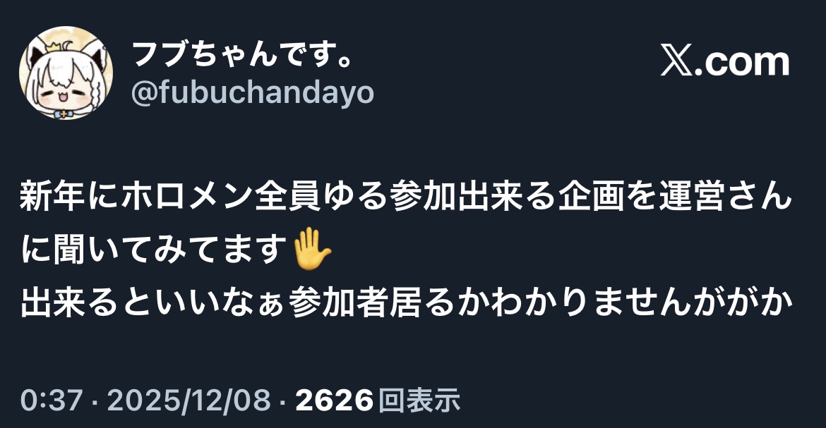 | … | 79無題Name名無し 25/12/08(月)00:44:40 IP:60.98.*(bbtec.net)No.11076137そうだねx1ロボ子さんのファンミ格ゲー好きな人が結構きてました |