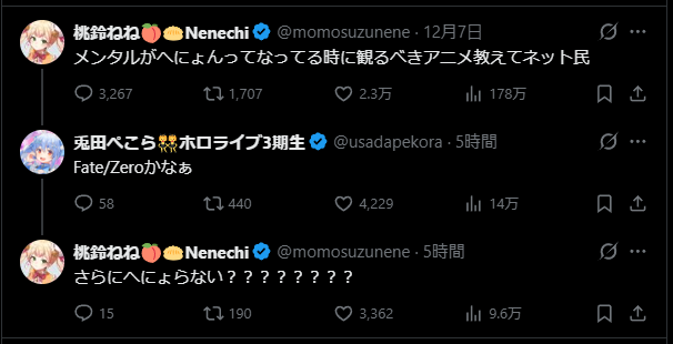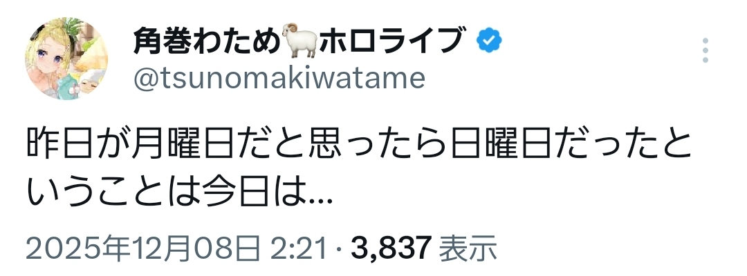 | … | 45無題Name名無し 25/12/08(月)00:11:47 IP:110.132.*(home.ne.jp)No.11076100そうだねx5ホロメンの配信を見てるといつの間にか月曜日になってしまってる |