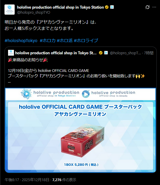| … | 25無題Name名無し 25/12/20(土)08:11:33No.11147446+HMVならスタートデッキ第1弾 ときのそら&AZKiはまだ買えるな |