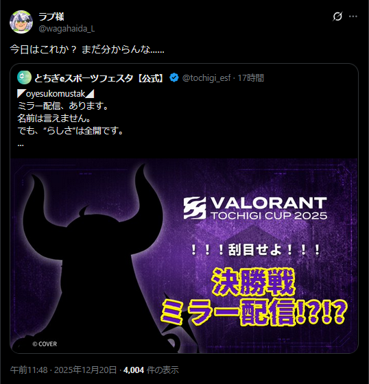 | … | 7無題Name名無し 25/12/20(土)11:35:03 IP:125.196.*(mesh.ad.jp)No.11148796+本当に初配信同時視聴やるんすか |