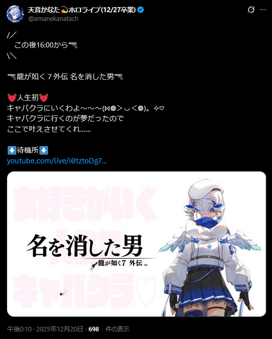 | … | 28無題Name名無し 25/12/20(土)11:36:03 IP:61.45.*(wakwak.ne.jp)No.11148817そうだねx2>初配信のヤバさで群を抜いている |