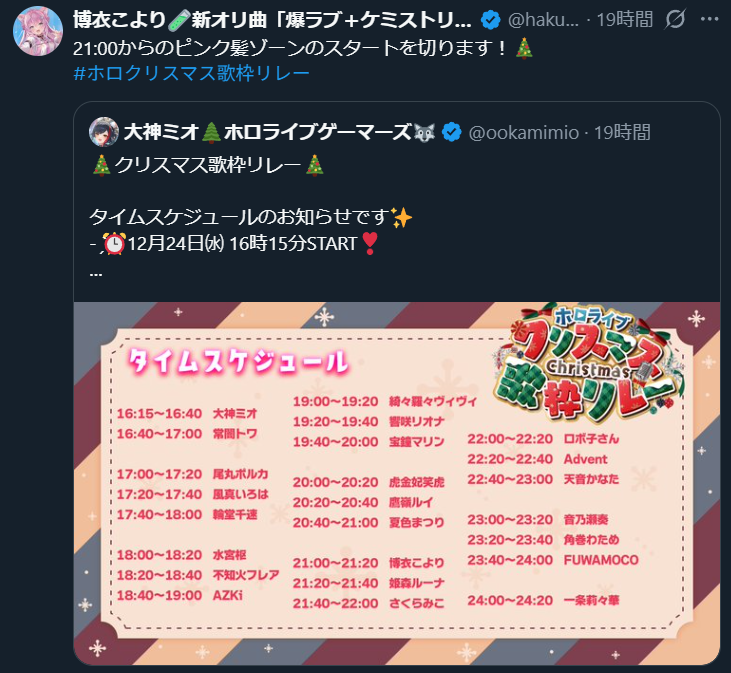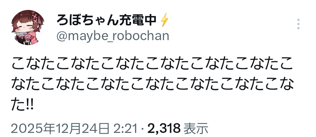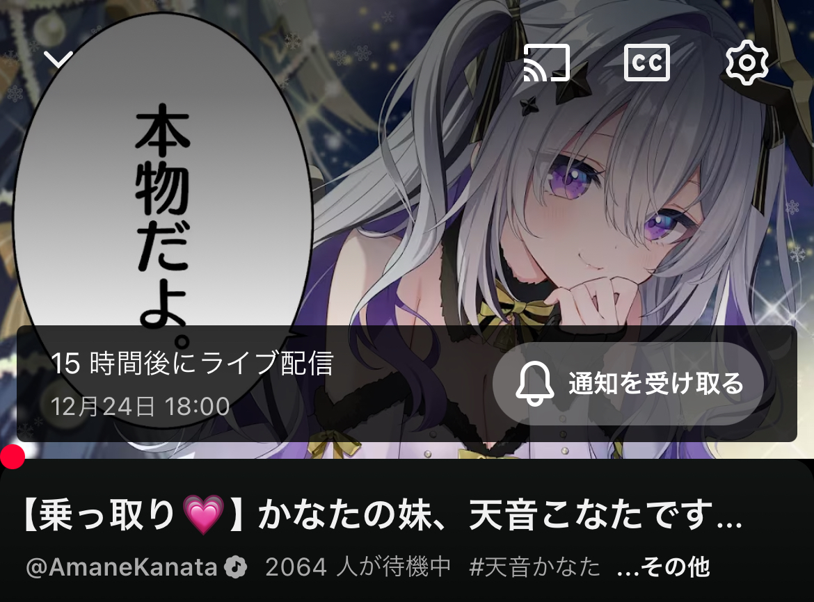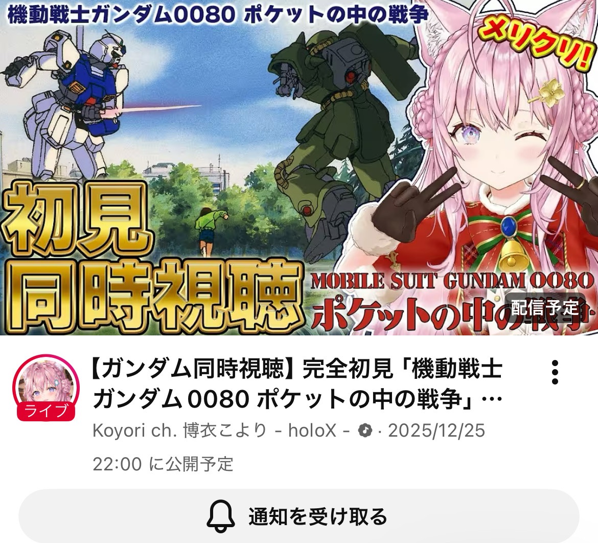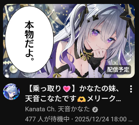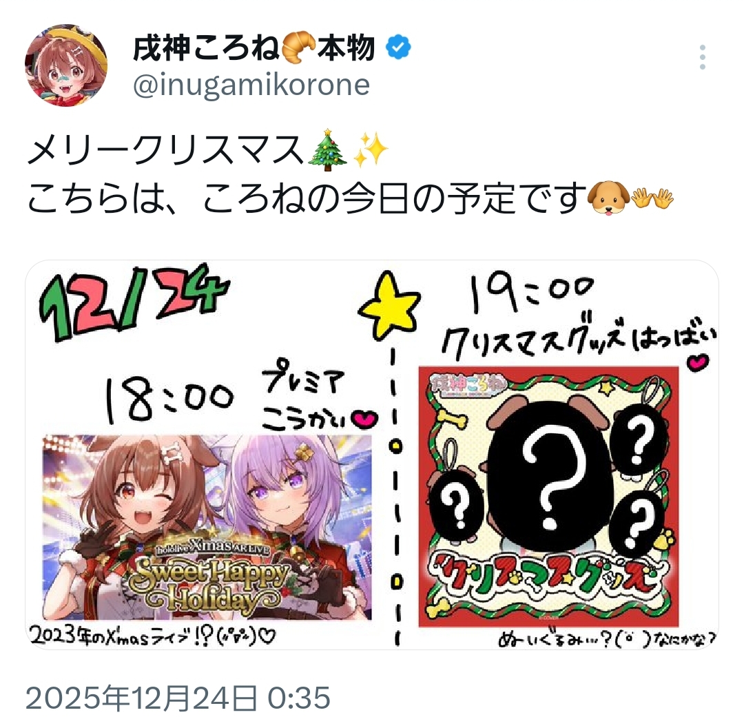 | … | 916無題Name名無し 25/12/24(水)06:33:37 IP:58.183.*(megaegg.ne.jp)No.11176506+起きて気づいたけど…こより1時間前に配信済みって… |
