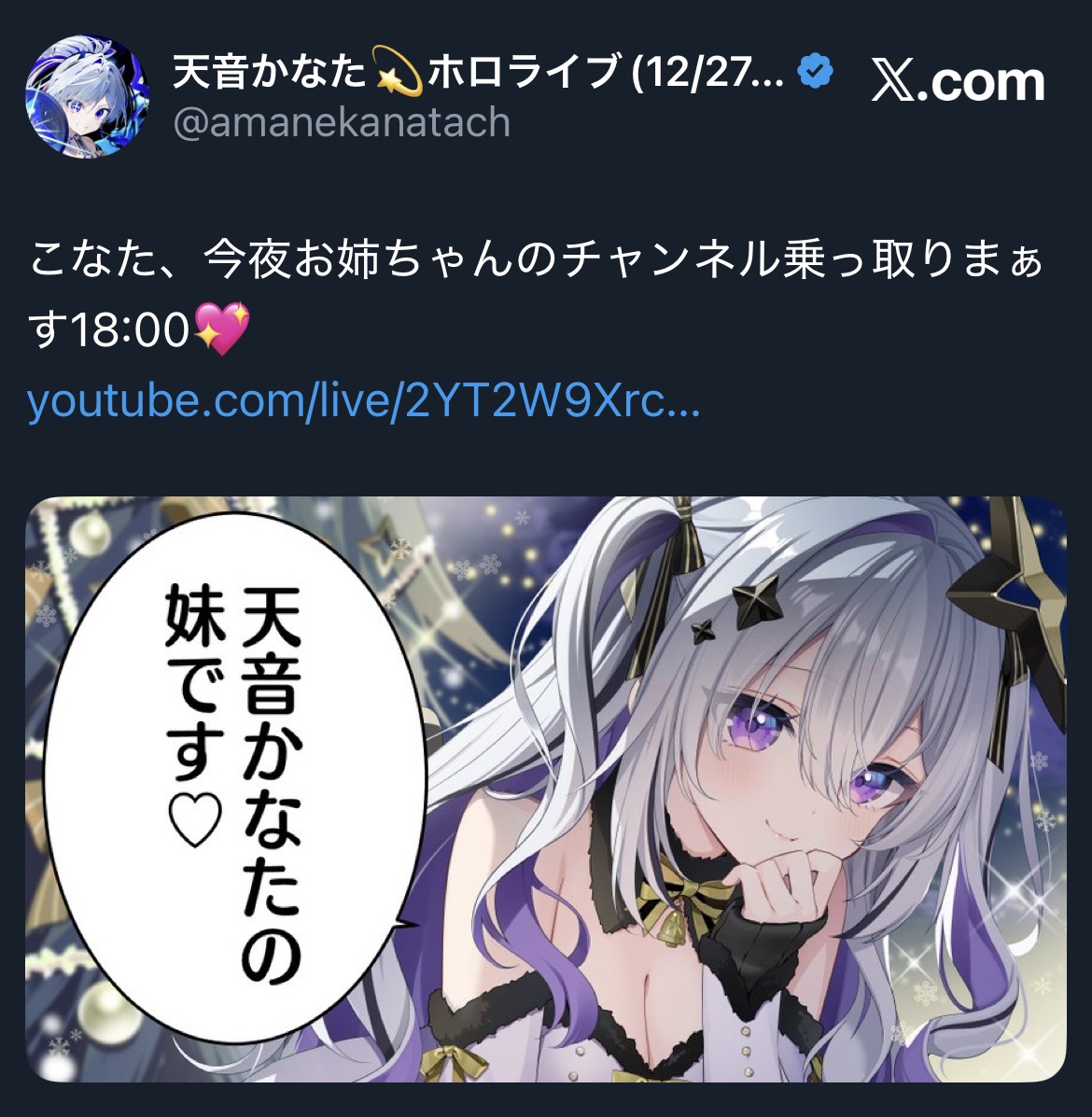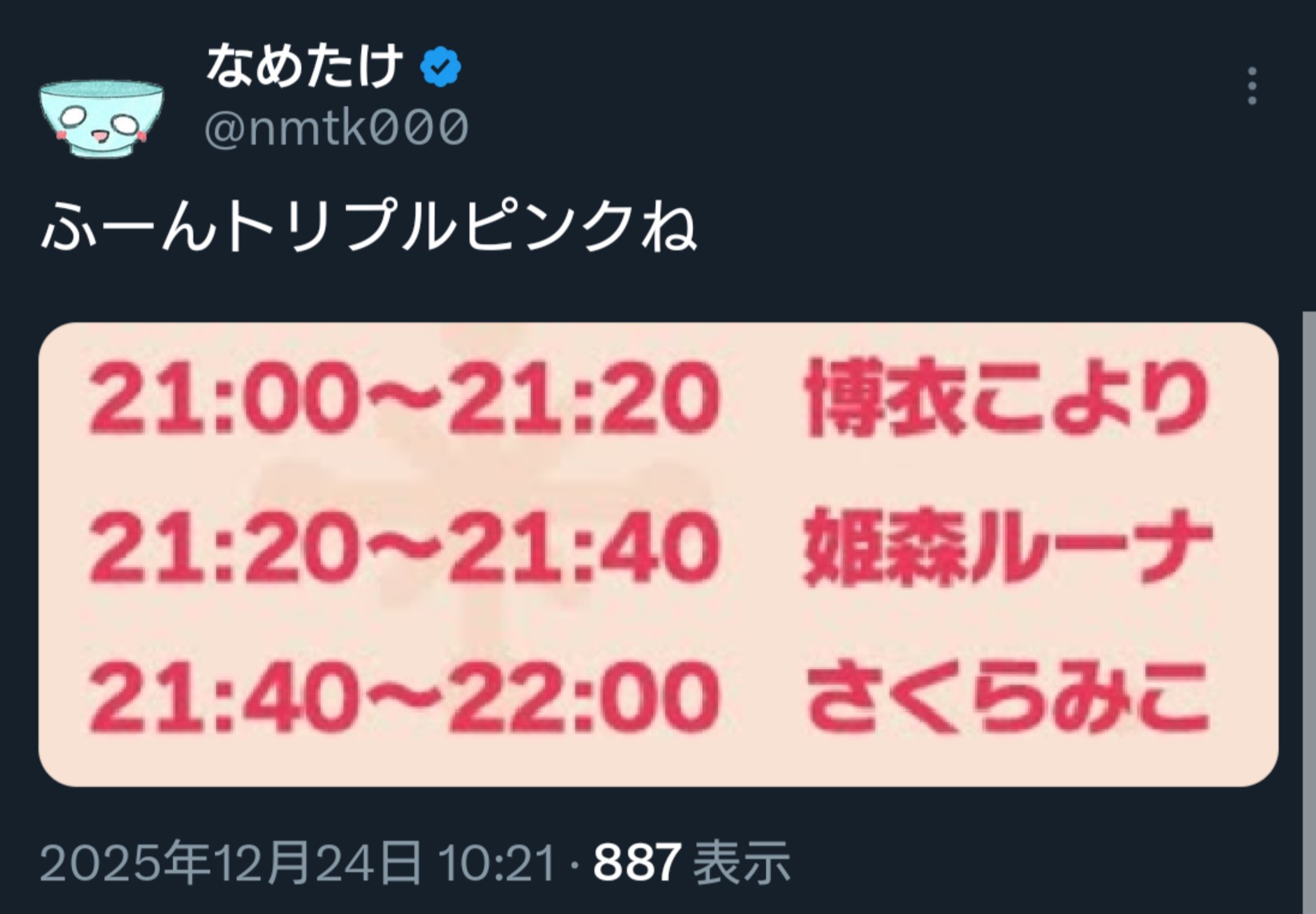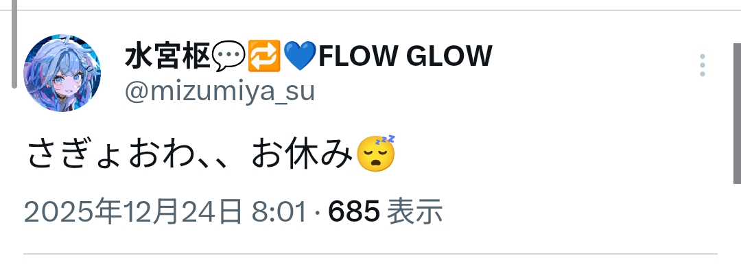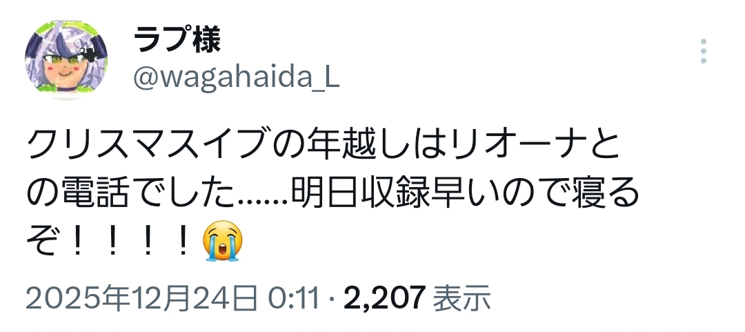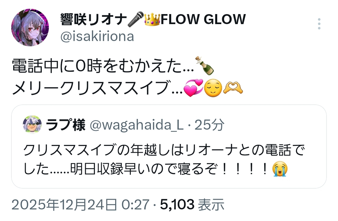| … | 916無題Name名無し 25/12/24(水)06:33:37 IP:58.183.*(megaegg.ne.jp)No.11176506+起きて気づいたけど…こより1時間前に配信済みって… |