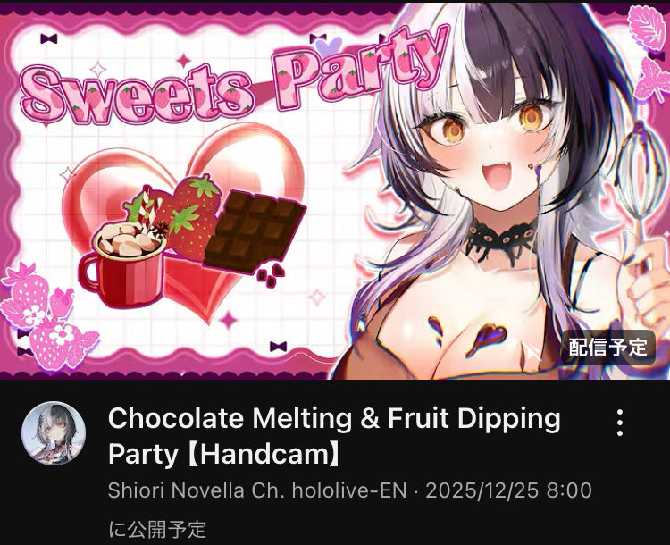 | … | 971無題Name名無し 25/12/24(水)10:14:24 IP:49.109.*(spmode.ne.jp)No.11176620+>クリスマスはしおりんのチョコレートパーティーカメラ配信だ |