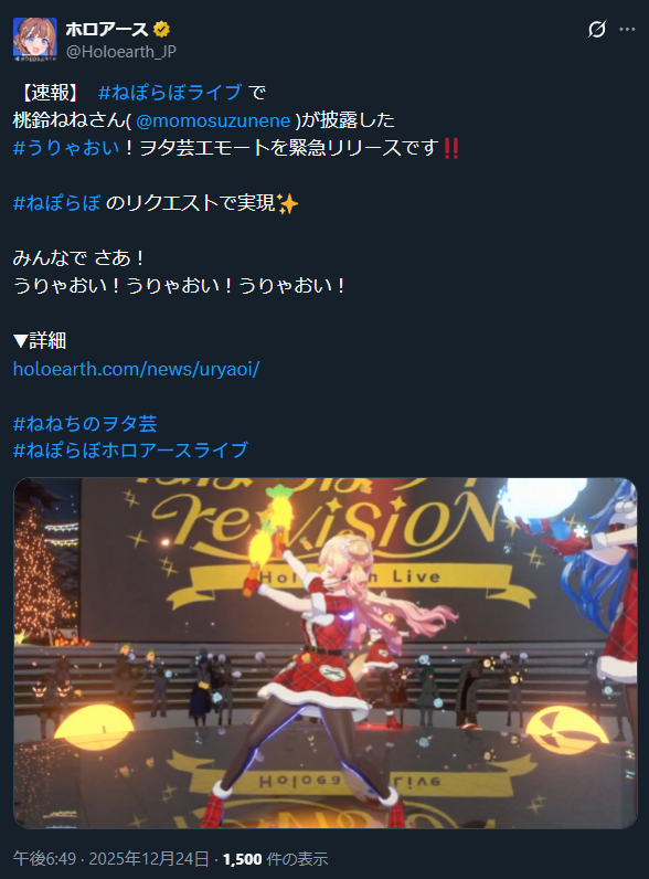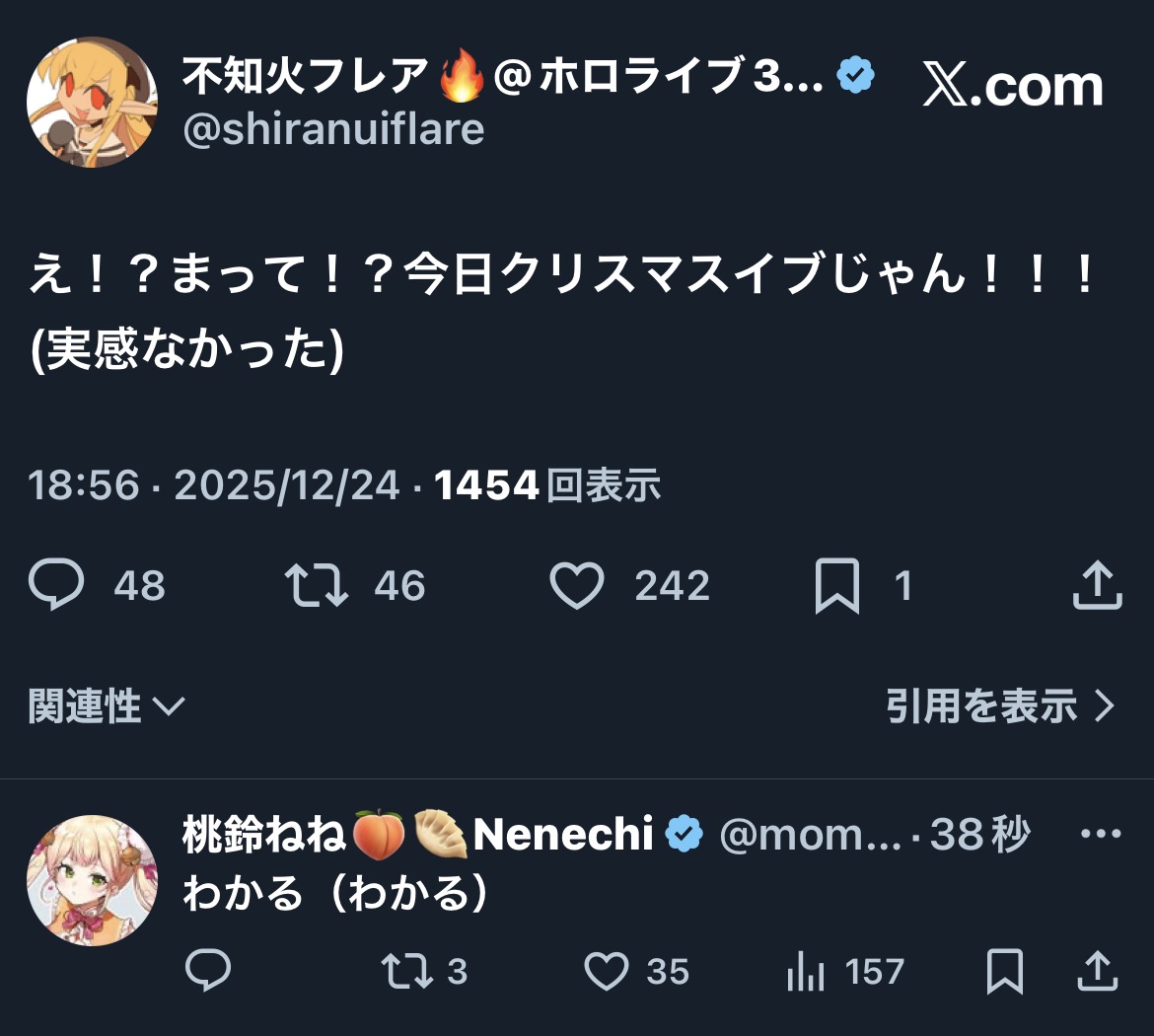 | … | 992無題Name名無し 25/12/24(水)20:03:29 IP:59.146.*(nuro.jp)No.11179847そうだねx1 1766574209830.jpg-(100987 B) https://x.com/hololivetv/status/2003782958407459121 |