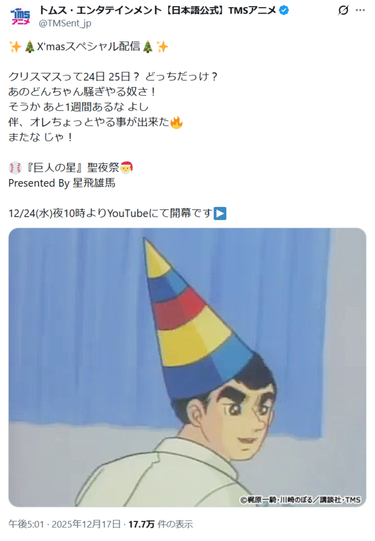 | … | 914無題Name名無し 25/12/24(水)19:59:34 IP:49.109.*(spmode.ne.jp)No.11179767+3Dで星飛雄馬再現するの待ってる |
