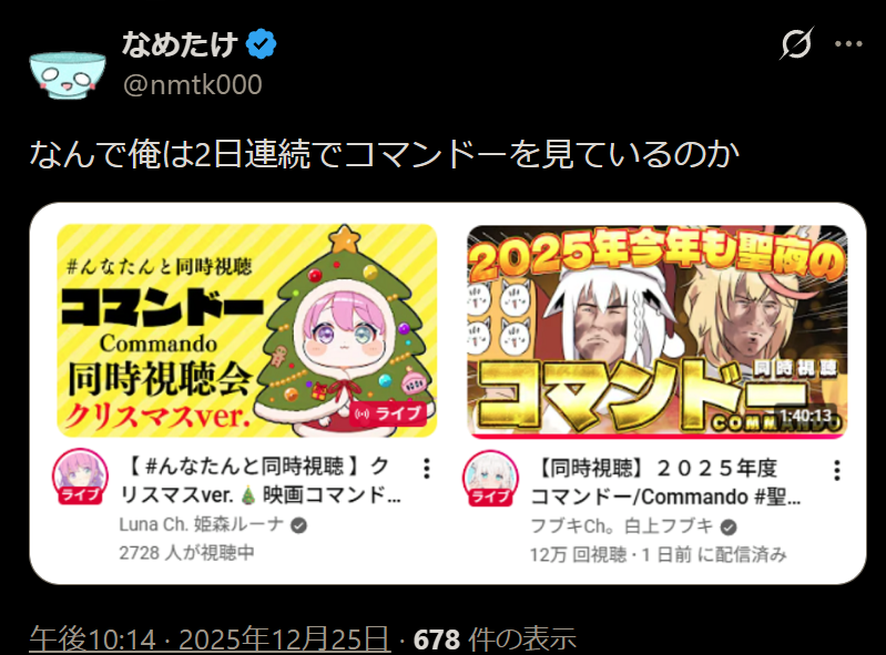 | … | 92無題Name名無し 25/12/25(木)22:12:17 IP:133.200.*(mesh.ad.jp)No.11194360そうだねx1今日も今日とてコマンドー |