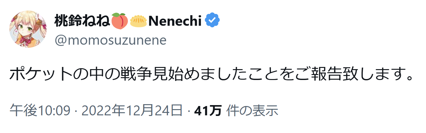 | … | 438無題Name名無し 25/12/26(金)01:53:26 IP:153.209.*(ocn.ne.jp)No.11196781+>先日ポケ戦同時視聴してた団長「ホロメンにも布教するわ」 |