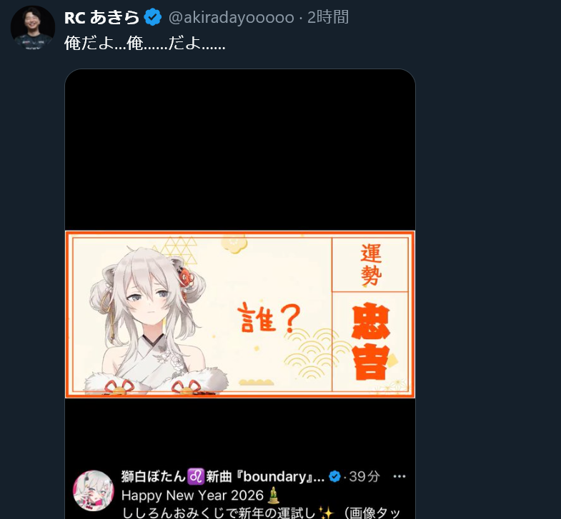 | … | 909無題Name名無し 26/01/01(木)10:13:57 IP:106.154.*(au-net.ne.jp)No.11278141+配信開始そうそうにふーたんのOBSが壊れた |