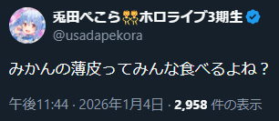 | … | 3無題Name名無し 26/01/04(日)22:49:59 IP:133.106.*(ipv4)No.11327406+ぺこらはiPhone13だったんか |