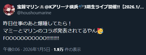 | … | 911無題Name名無し 26/01/05(月)18:23:37 IP:126.6.*(bbtec.net)No.11329554+まつりちゃん今後オリ曲のMVが出まくります |
