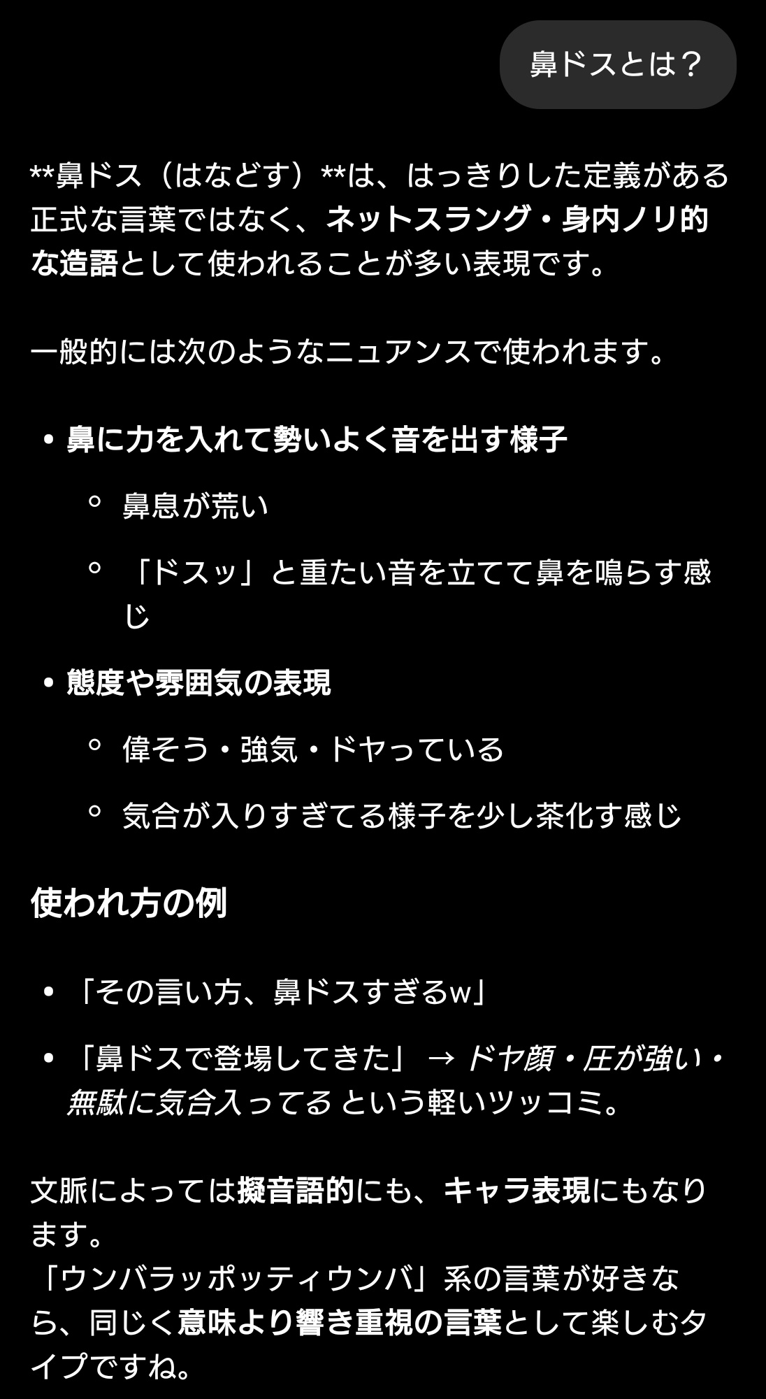 | … | 18無題Name名無し 26/01/10(土)08:42:31No.11352599+ 1768002151472.jpg-(305772 B) すいちゃんといつも行ってる鼻ドスってなんだと思ってAIに聞いたら… |