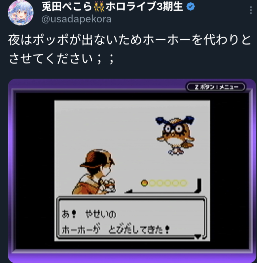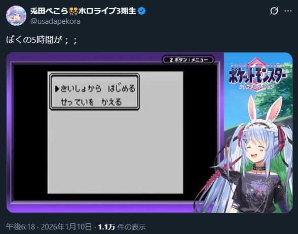 | … | 1000無題Name名無し 26/01/10(土)20:45:25 IP:27.253.*(bmobile.ne.jp)No.11356824+>>各ホロメンが地元を紹介するだけのゲームでも買うので出してくれんかな |