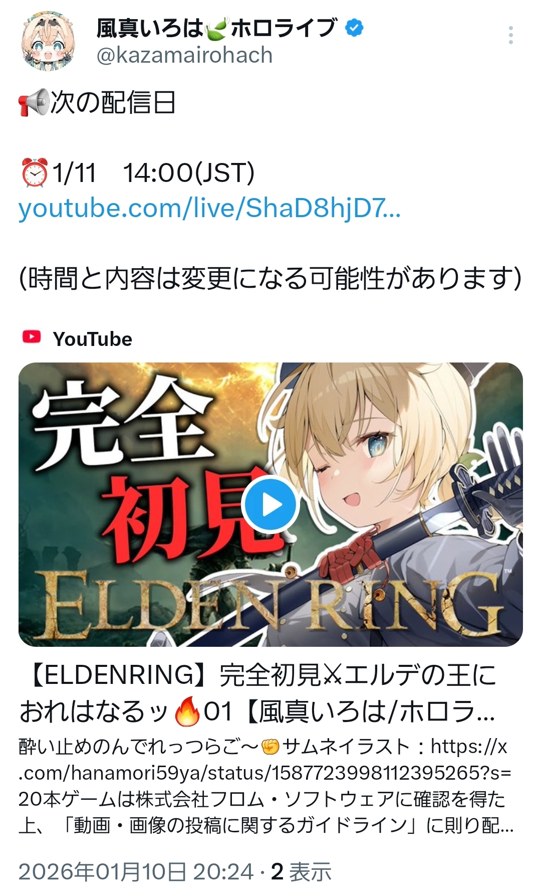 | … | 969無題Name名無し 26/01/10(土)20:44:31 IP:126.6.*(bbtec.net)No.11356792+頭にスバちゃん乗せられません |